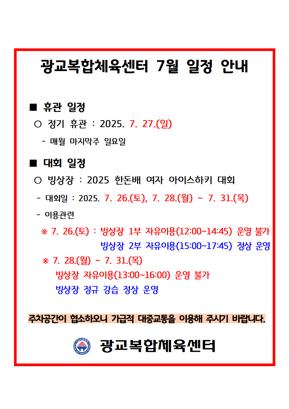 광교복합체육센터 2025년 7월 일정(휴관) 안내(수정공지) 작성자 관리자 등록일자 2025년 6월 17일 11시 17분 22초 조회 2,471 월별 일정(휴관) 공지_2025_07월001.png [ Size : 83.62KB , Down : 1,890 ] 미리보기 다운로드 목록보기