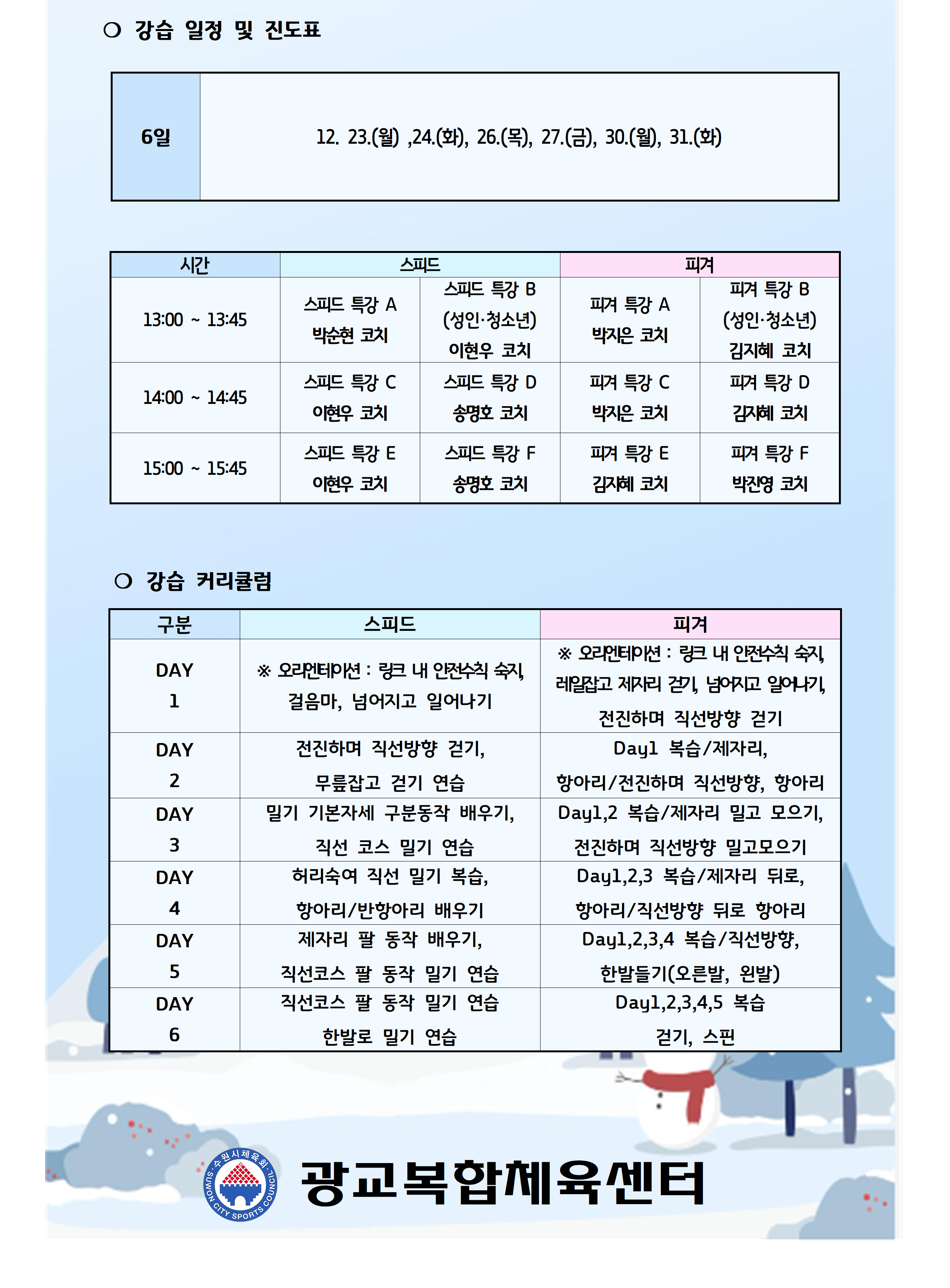 광교복합체육센터 빙상장 겨울방학 특강 운영 공지 작성자 관리자 등록일자 2024년 11월 15일 16시 20분 0초 조회 1,305 2024. 11_겨울방학특강 홍보(최종)001.png [ Size : 1.15MB , Down : 842 ] 미리보기 다운로드 2024. 11_겨울방학특강 홍보(최종)002.png [ Size : 733.16KB , Down : 822 ] 미리보기 다운로드 목록보기
