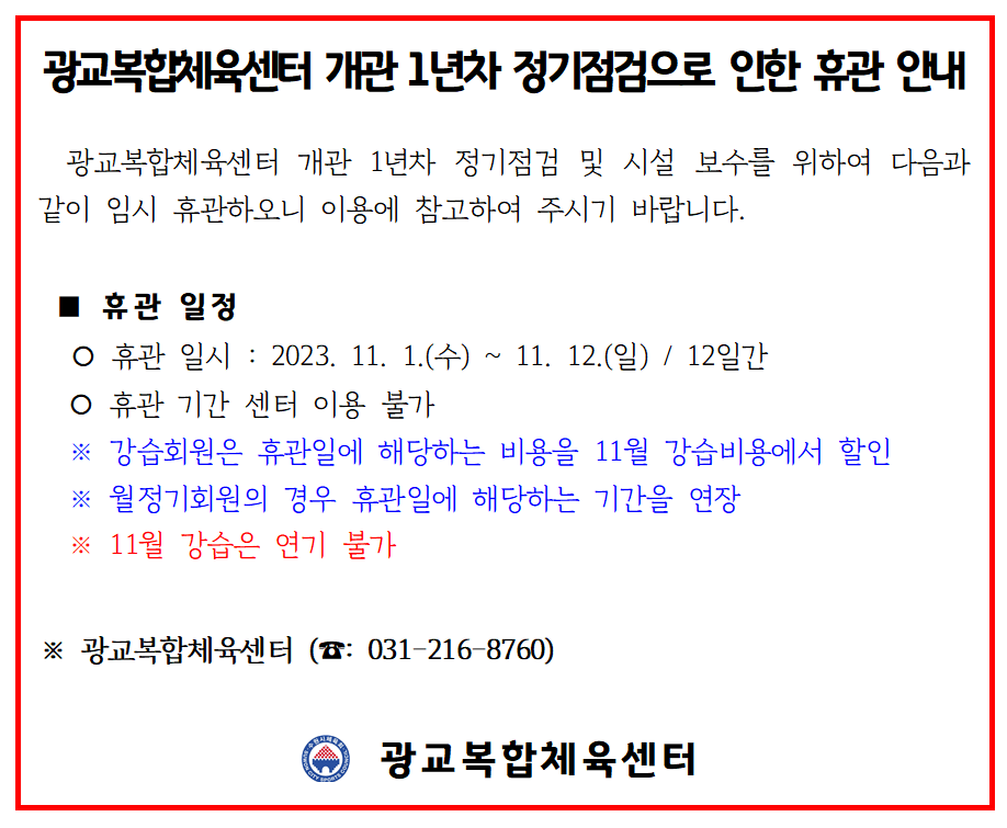 광교복합체육센터 개관 1년차 정기점검으로 인한 휴관 안내(수정 안내) 작성자 관리자 등록일자 2023년 10월 13일 8시 16분 57초 조회 1,458 임시 휴관 안내문001 - 홈페이지.png [ Size : 68.89KB , Down : 1,434 ] 미리보기 다운로드 목록보기