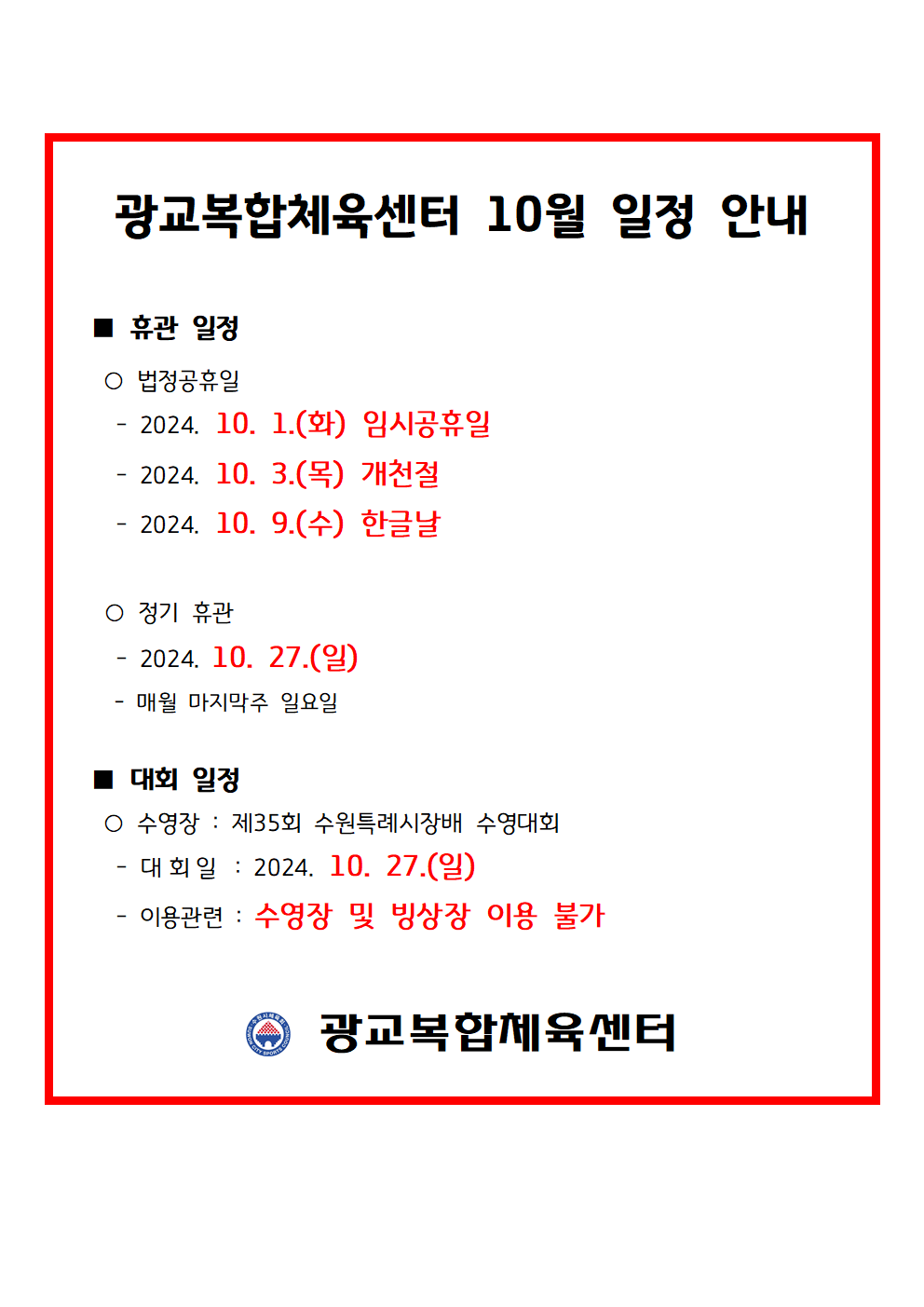 광교복합체육센터 2024년 10월 일정(휴관) 안내 작성자 관리자 등록일자 2024년 9월 12일 15시 19분 4초 조회 3,657 10월 일정(휴관) 공지001001.png [ Size : 54.13KB , Down : 4,462 ] 미리보기 다운로드 목록보기