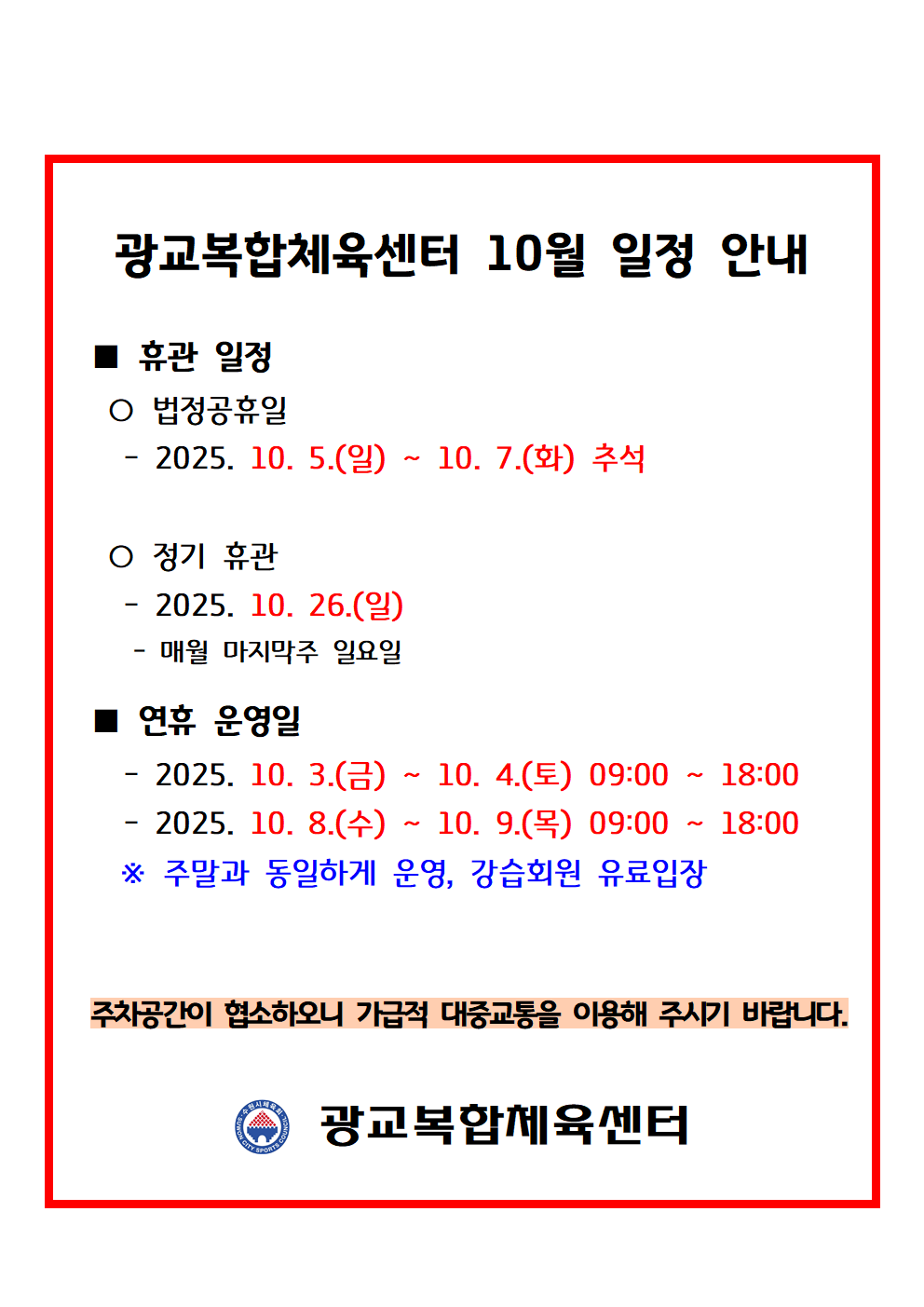 공지 광교복합체육센터 2025년 10월 일정(휴관) 안내 작성자 관리자 등록일자 2025년 9월 17일 13시 26분 23초 조회 2,279 월별 일정(휴관) 공지_2025_10월001.png [ Size : 73.09KB , Down : 2,831 ] 미리보기 다운로드 목록보기