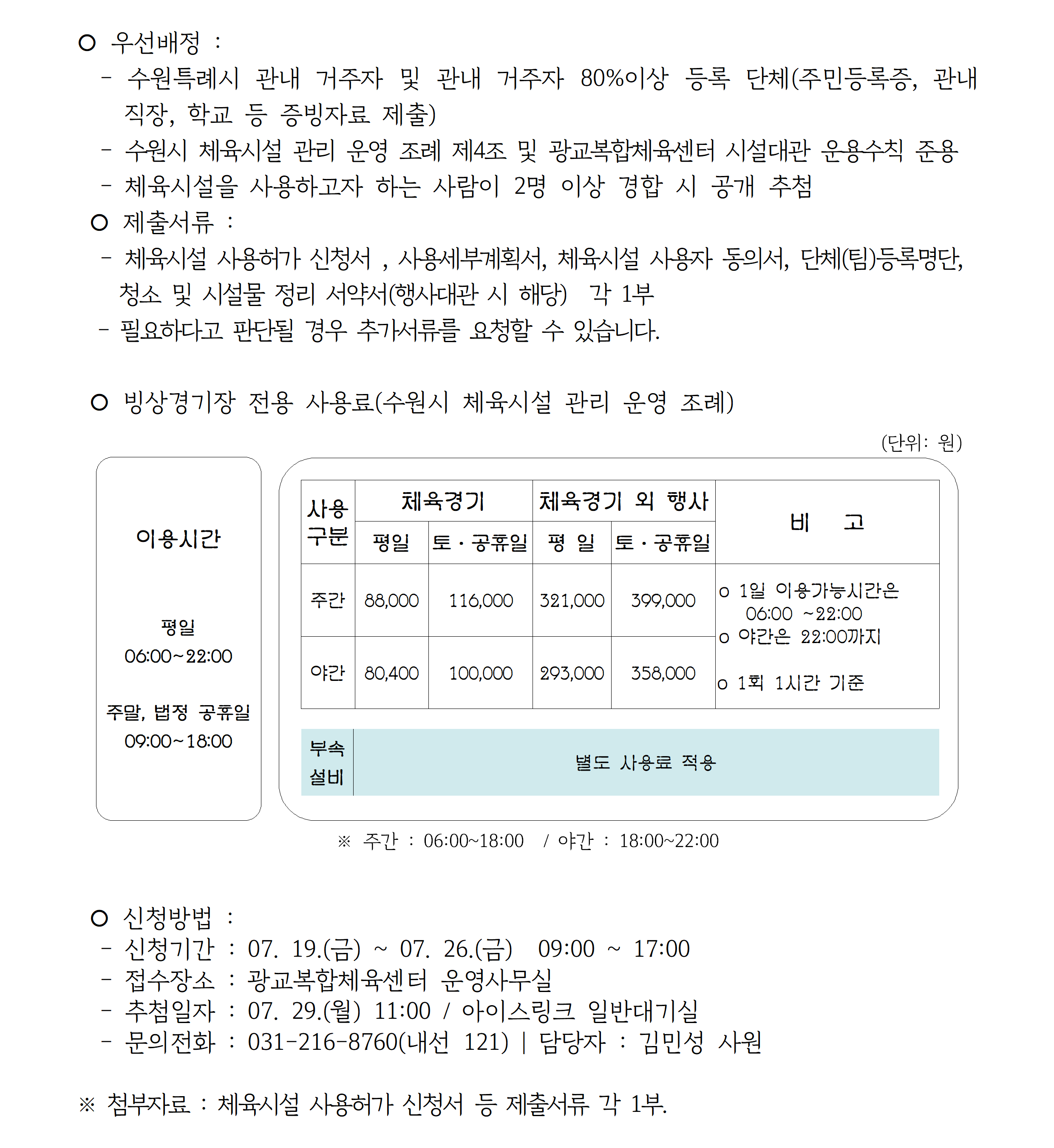 8월 아이스링크장 (수시)시범대관 공지 작성자 관리자 등록일자 2024년 7월 19일 8시 54분 59초 조회 1,347 ('24.08.) 아이스링크 수시대관_공지사항(공지용)001.png [ Size : 280.26KB , Down : 1,291 ] 미리보기 다운로드 ('24.08.) 아이스링크 수시대관_공지사항(공지용)002.png [ Size : 335.04KB , Down : 1,303 ] 미리보기 다운로드 아이스링크 대관_신청서.hwp [ Size : 266.5KB , Down : 371 ] 다운로드 목록보기