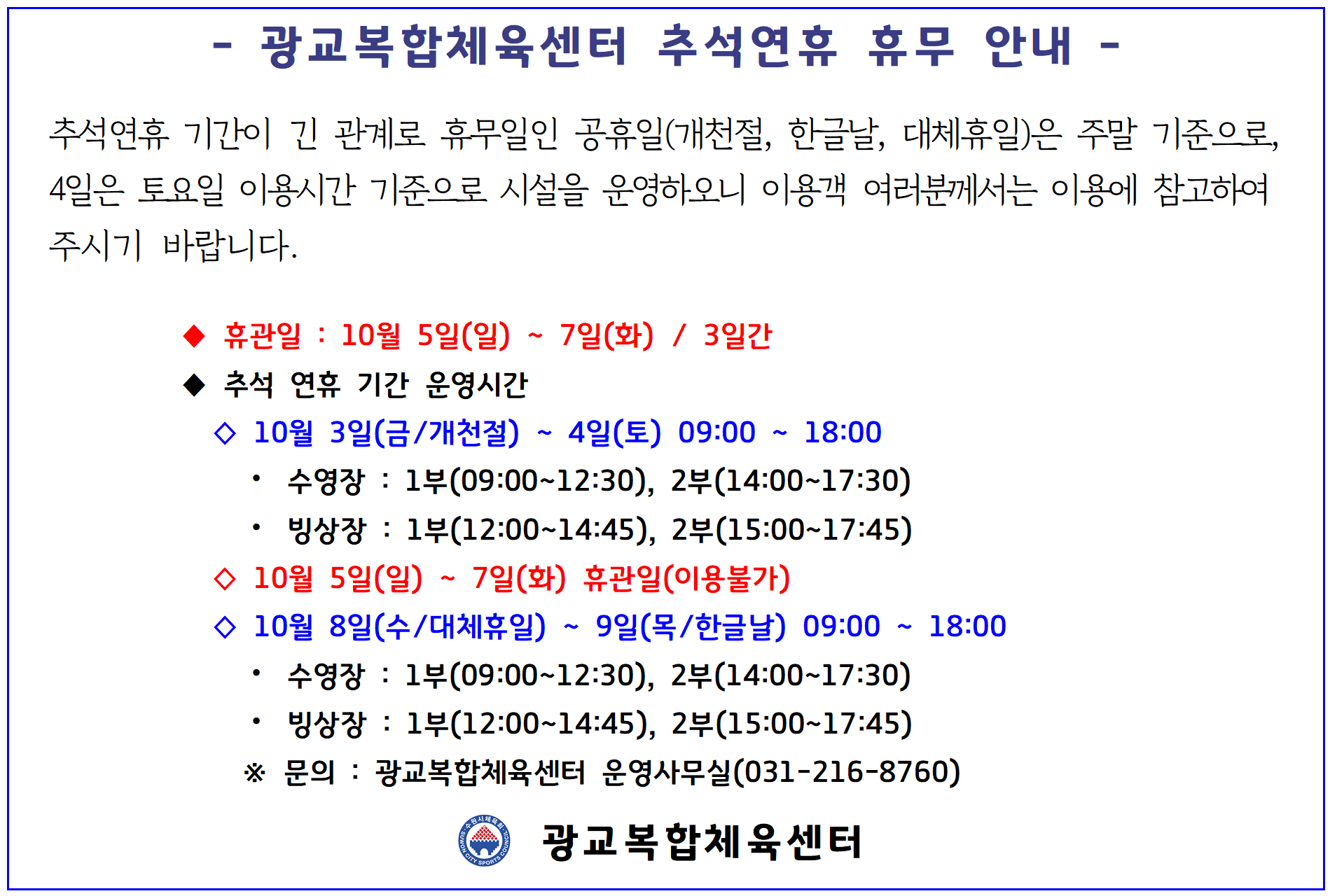 추석연휴 휴무 안내 작성자 관리자 등록일자 2025년 9월 17일 16시 38분 54초 조회 2,341 추석연휴 휴무 안내001.png [ Size : 153.73KB , Down : 3,281 ] 미리보기 다운로드 목록보기