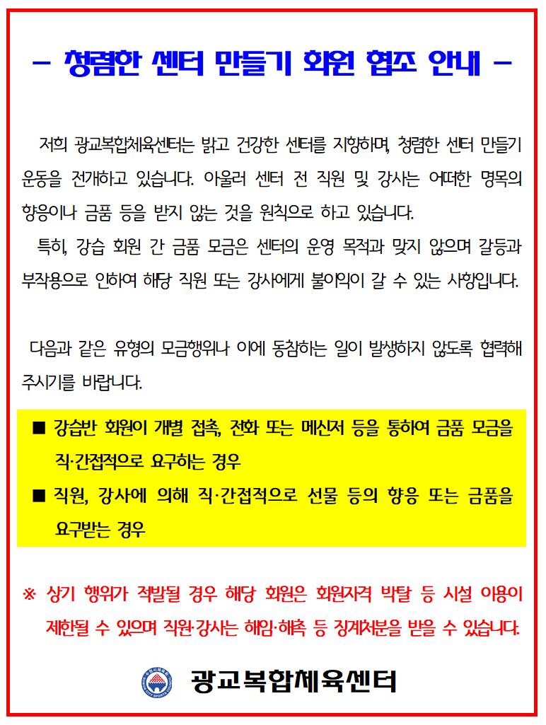 청렴한 센터 만들기 협조 안내문 작성자 관리자 등록일자 2024년 5월 14일 13시 52분 33초 조회 898 청렴한 센터 조성운동000001.png [ Size : 87.08KB , Down : 762 ] 미리보기 다운로드 목록보기
