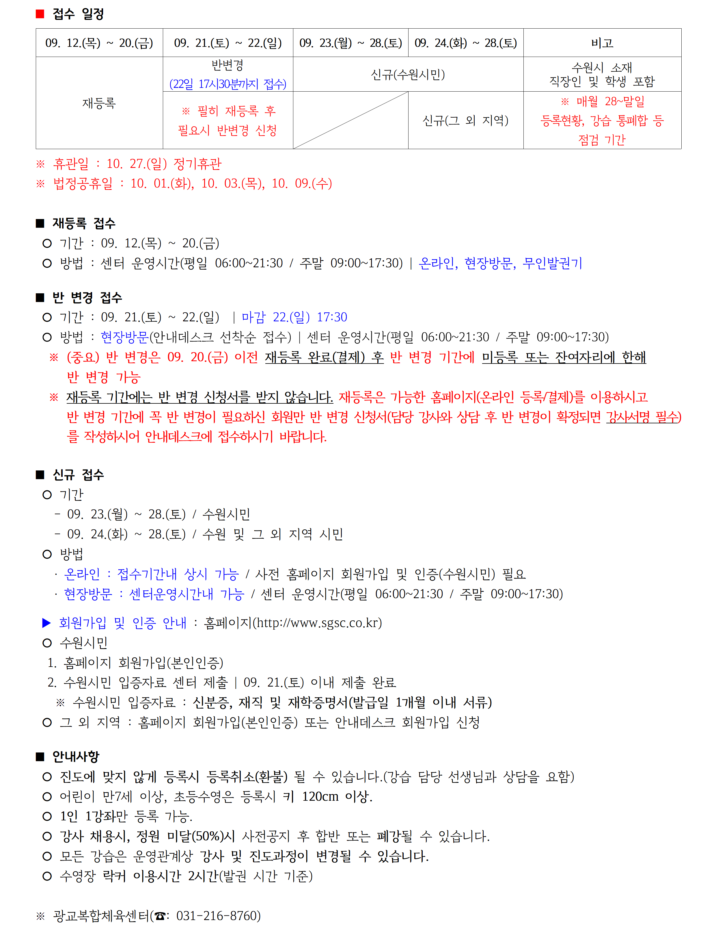 광교복합체육센터 10월 수영-빙상 진도표 공지
