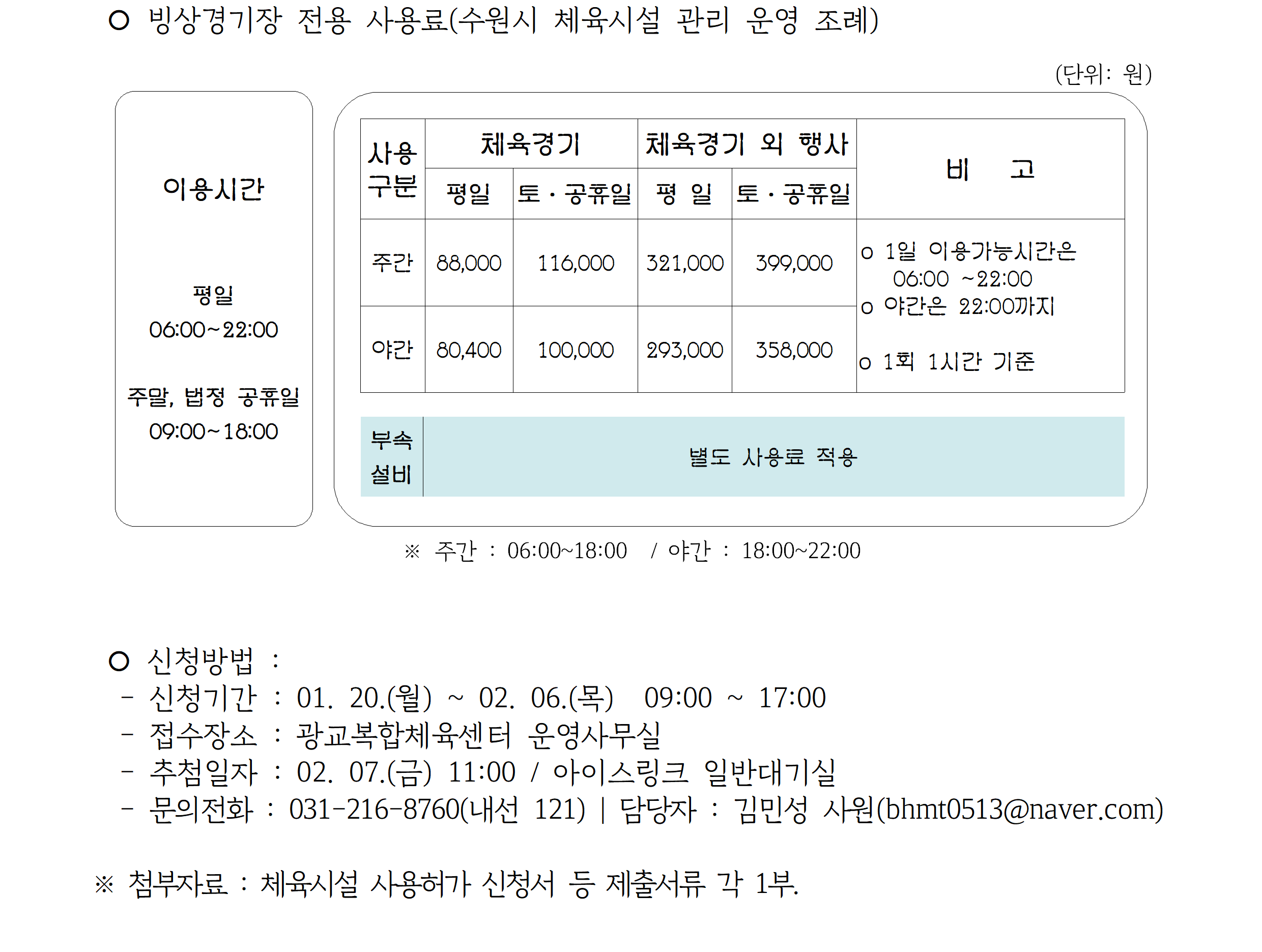 2025년 2월 아이스링크장 (수시)임시대관 공지 작성자 관리자 등록일자 2025년 1월 20일 16시 2분 26초 조회 927 (25.02) 아이스링크 임시대관_공지사항001.png [ Size : 316.79KB , Down : 874 ] 미리보기 다운로드 (25.02) 아이스링크 임시대관_공지사항002.png [ Size : 211.89KB , Down : 868 ] 미리보기 다운로드 아이스링크 대관_신청서.hwp [ Size : 267KB , Down : 343 ] 다운로드 목록보기