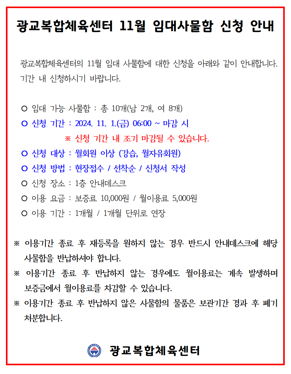 광교복합체육센터 2024년 11월 임대사물함 신청 안내 작성자 관리자 등록일자 2024년 10월 23일 15시 16분 23초 조회 1,269 11월 임대사물함 신청 안내001.png [ Size : 109.15KB , Down : 1,295 ] 미리보기 다운로드 목록보기