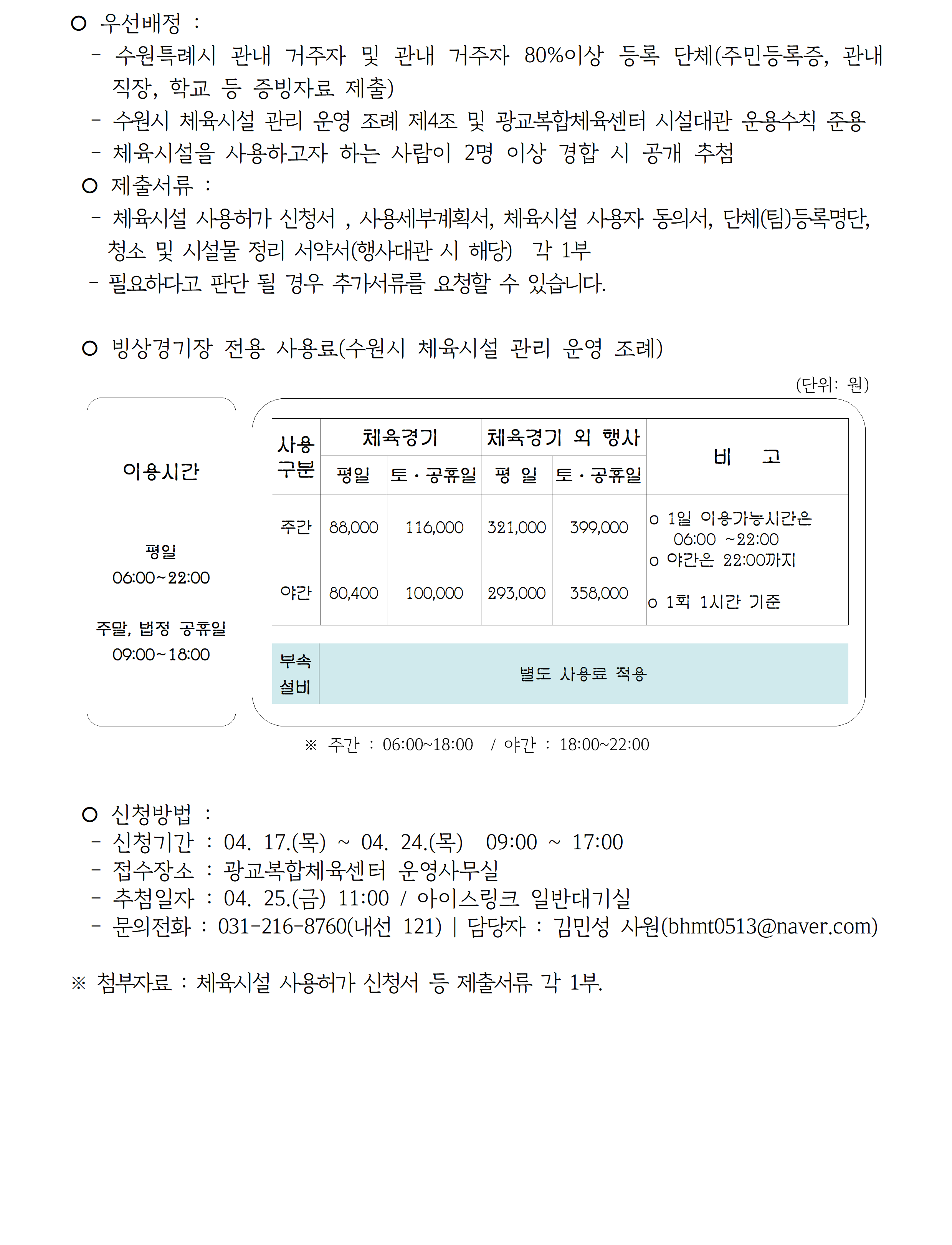 2025년 5월 아이스링크장 (수시)시범대관 공지 작성자 관리자 등록일자 2025년 4월 17일 9시 54분 6초 조회 649 ('25.05) 아이스링크 수시대관_공지사항(공지용)001.png [ Size : 269.42KB , Down : 524 ] 미리보기 다운로드 ('25.05) 아이스링크 수시대관_공지사항(공지용)002.png [ Size : 346.71KB , Down : 546 ] 미리보기 다운로드 아이스링크 대관_신청서.hwp [ Size : 267KB , Down : 235 ] 다운로드 목록보기