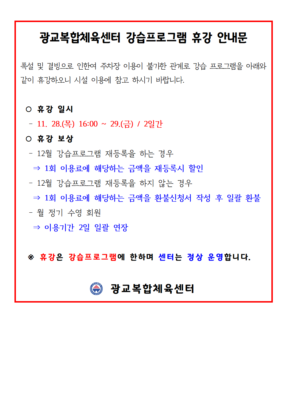 광교복합체육센터 임시 휴강 안내 작성자 관리자 등록일자 2024년 11월 28일 14시 0분 37초 조회 2,281 임시 휴강 안내001.png [ Size : 71.95KB , Down : 2,554 ] 미리보기 다운로드 목록보기