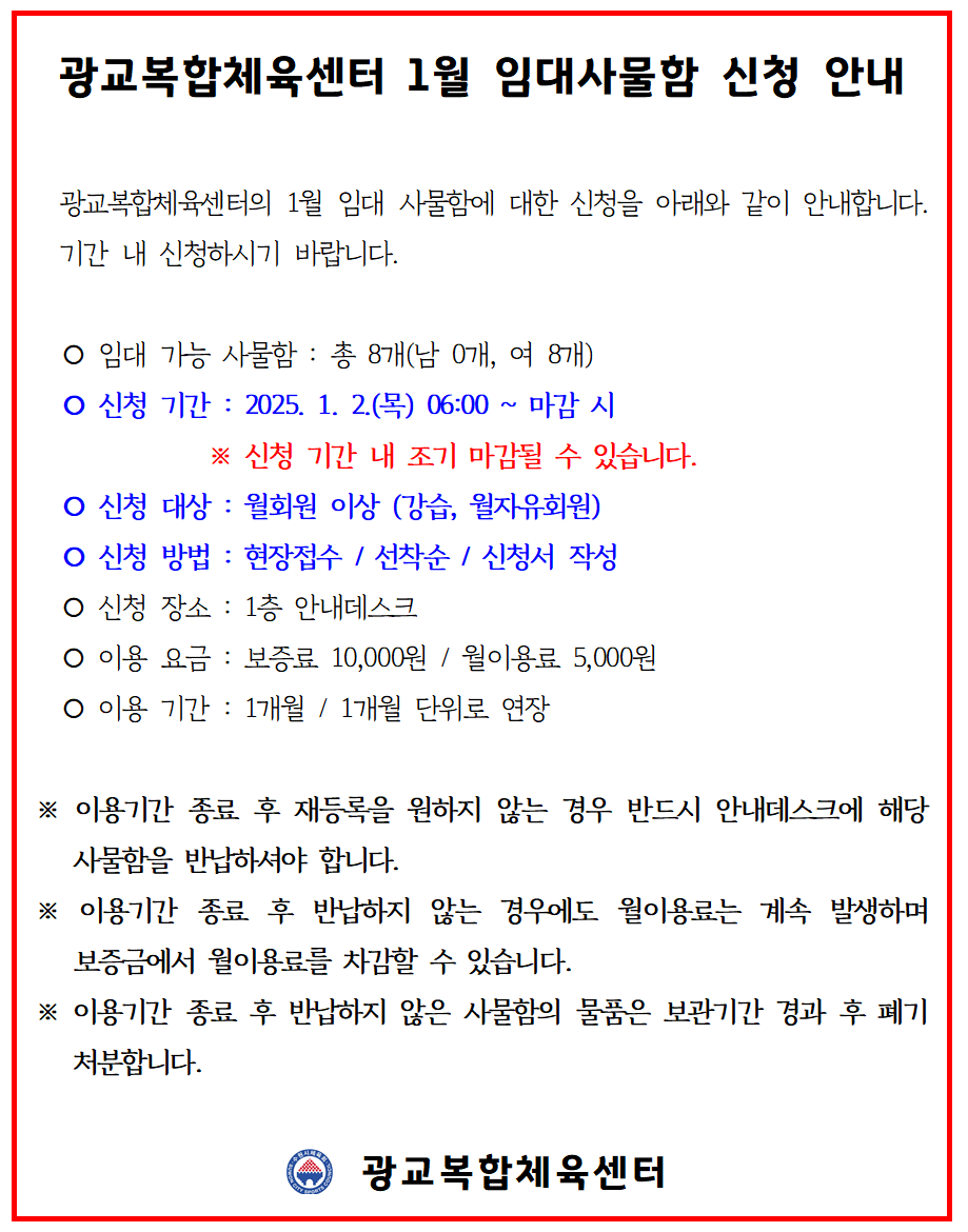 광교복합체육센터 2025년 1월 임대사물함 신청 안내 작성자 관리자 등록일자 2024년 12월 26일 17시 1분 49초 조회 992 2025 01 임대사물함 신청 안내001.png [ Size : 108.08KB , Down : 905 ] 미리보기 다운로드 목록보기