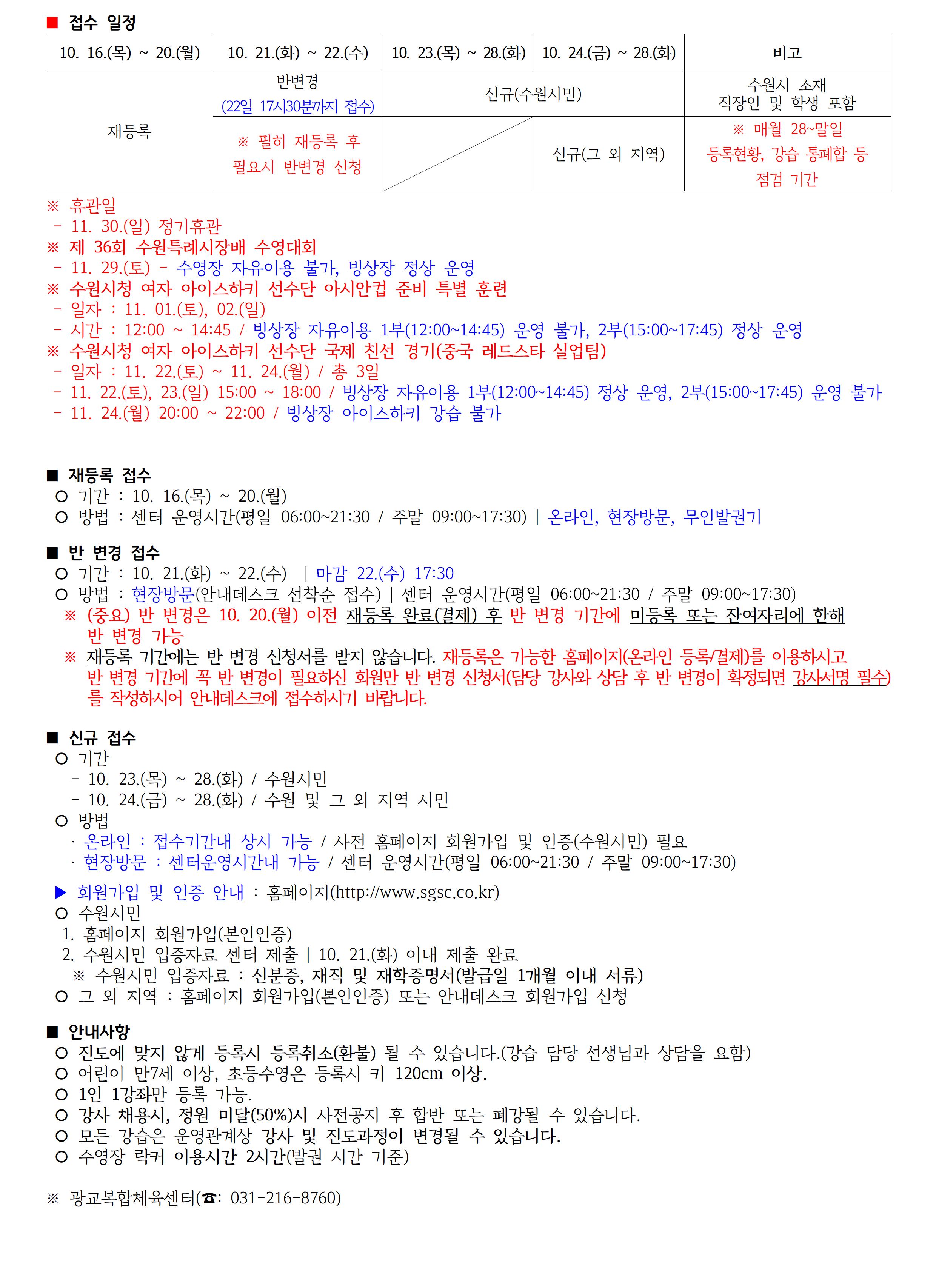 공지 광교복합체육센터 2025년 11월 수영-빙상 진도표 공지