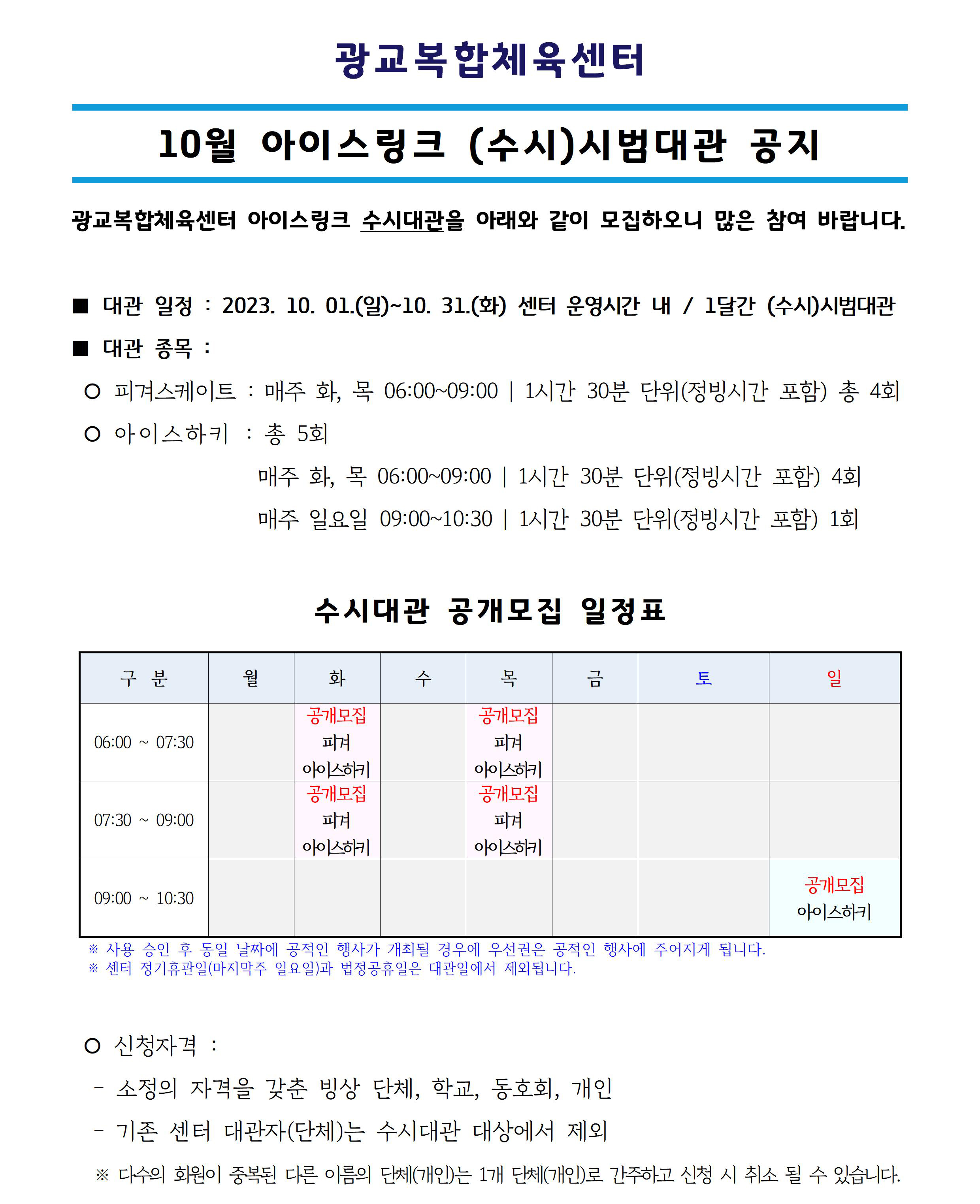 10월 아이스링크장 (수시)시범대관 공지 작성자 관리자 등록일자 2023년 9월 18일 9시 5분 46초 조회 1,294 ('23.10.) 아이스링크 수시대관_공지사항001.jpg [ Size : 1.66MB , Down : 1,447 ] 미리보기 다운로드 ('23.10.) 아이스링크 수시대관_공지사항002.jpg [ Size : 1.74MB , Down : 1,380 ] 미리보기 다운로드 ('23.10.) 아이스링크 수시대관_신청서.pdf [ Size : 173.86KB , Down : 611 ] 다운로드 목록보기