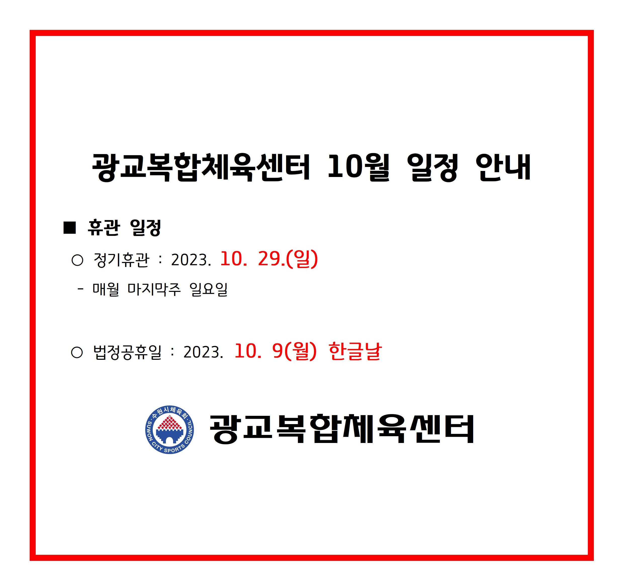 광교복합체육센터 10월 일정(휴관) 안내(수정안내) 작성자 관리자 등록일자 2023년 9월 22일 13시 37분 19초 조회 2,829 10월 일정(휴관) 공지001.jpg [ Size : 318.48KB , Down : 2,792 ] 미리보기 다운로드 목록보기