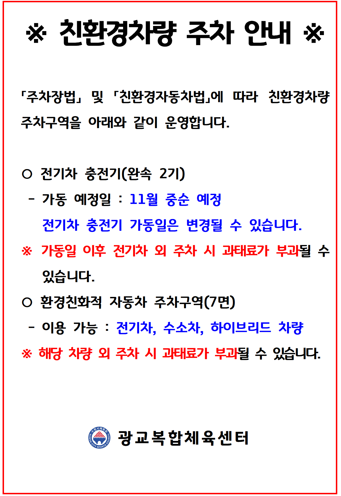 공지 광교복합체육센터 친환경차량 주차 안내 작성자 관리자 등록일자 2025년 10월 23일 10시 11분 0초 조회 231 20251023 친환경차량 주차 안내001.png [ Size : 121.92KB , Down : 216 ] 미리보기 다운로드 목록보기