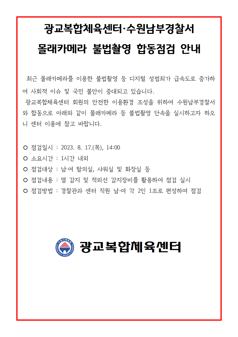 광교복합체육센터, 수원남부경찰서 몰래카메라 불법촬영 합동점검 안내 작성자 관리자 등록일자 2023년 8월 14일 11시 34분 21초 조회 1,731 불법촬영합동점검 안내-20230811001.png [ Size : 82.7KB , Down : 3,006 ] 미리보기 다운로드 목록보기