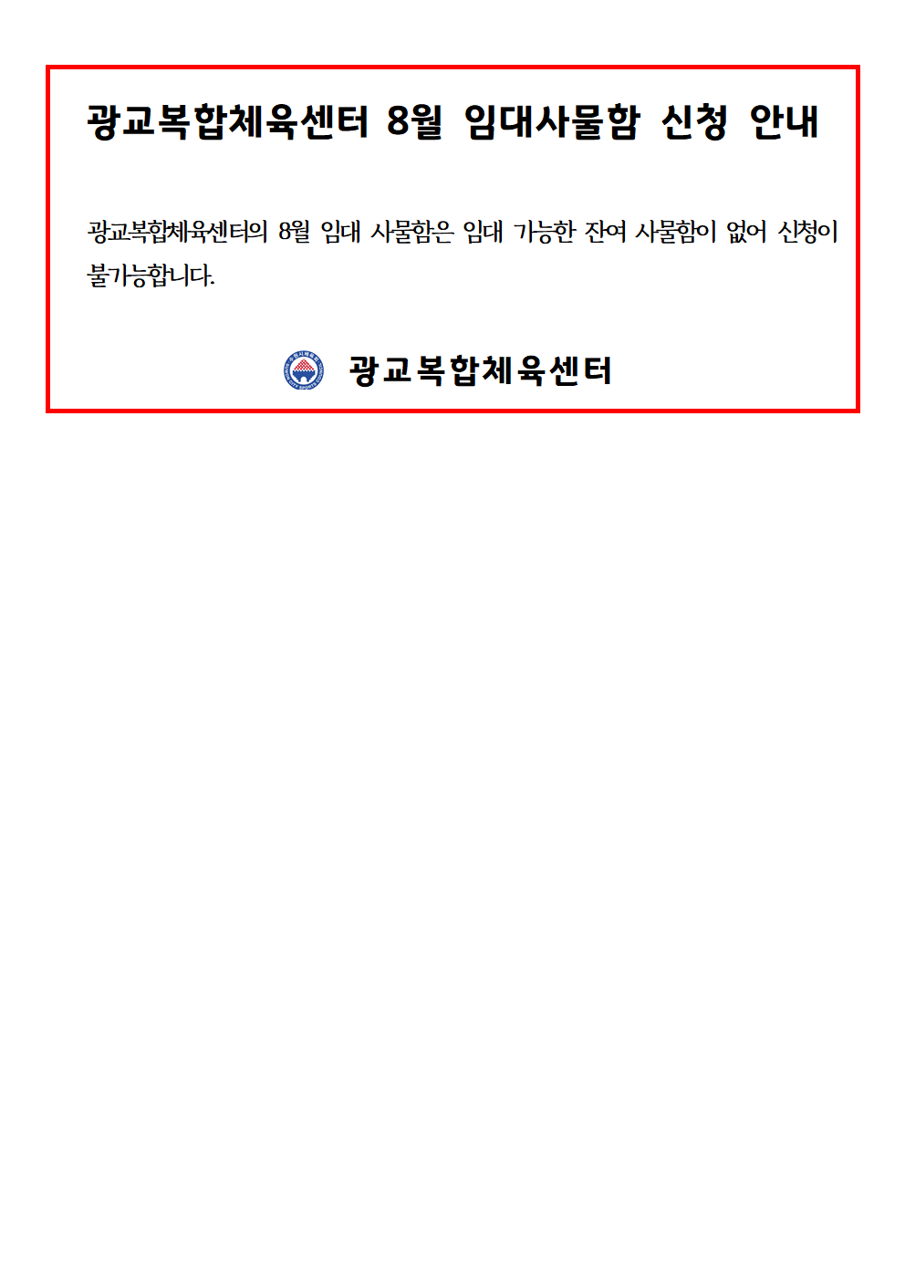 광교복합체육센터 2024년 8월 임대사물함 신청 안내 작성자 관리자 등록일자 2024년 7월 30일 18시 11분 51초 조회 1,044 8월 임대사물함 신청 안내001.png [ Size : 31.96KB , Down : 940 ] 미리보기 다운로드 목록보기