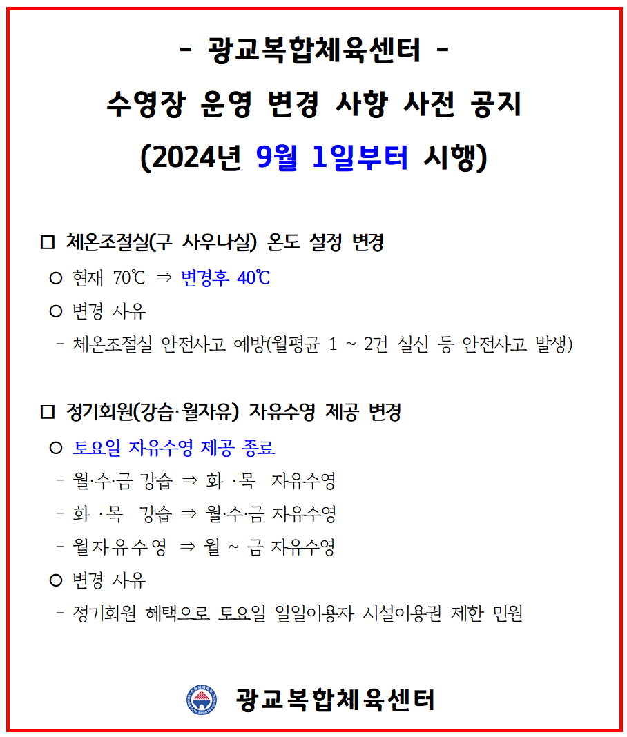 광교복합체육센터 수영장 운영 변경사항 예정 공지 작성자 관리자 등록일자 2024년 7월 15일 17시 29분 23초 조회 17,679 수영장 운영 변경 사항 사전 공지001.png [ Size : 76.9KB , Down : 26,160 ] 미리보기 다운로드 목록보기