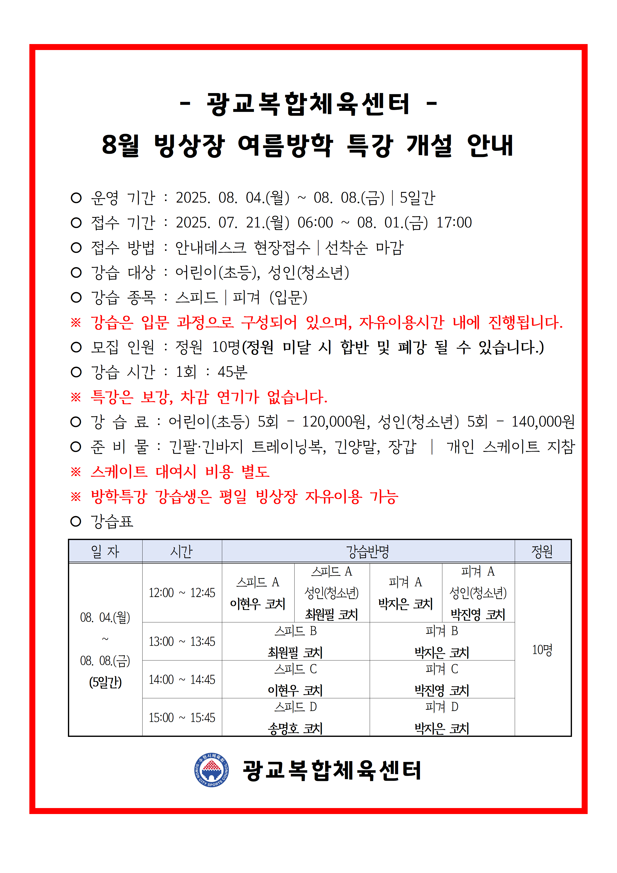 광교복합체육센터 빙상장 여름방학 특강 운영 공지 작성자 관리자 등록일자 2025년 7월 10일 13시 28분 53초 조회 2,522 250708_여름 방학 빙상 특강 공지001.png [ Size : 312.45KB , Down : 3,444 ] 미리보기 다운로드 250708_여름 방학 빙상 특강 공지002.png [ Size : 176.77KB , Down : 3,366 ] 미리보기 다운로드 목록보기