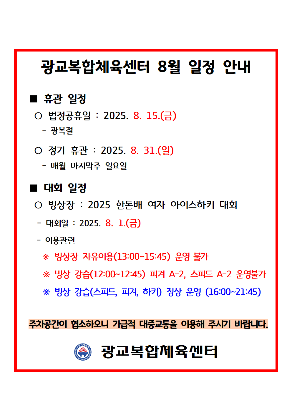 광교복합체육센터 2025년 8월 일정(휴관) 안내 작성자 관리자 등록일자 2025년 7월 16일 9시 30분 18초 조회 2,893 월별 일정(휴관) 공지_2025_08월001.png [ Size : 82.45KB , Down : 3,465 ] 미리보기 다운로드 목록보기