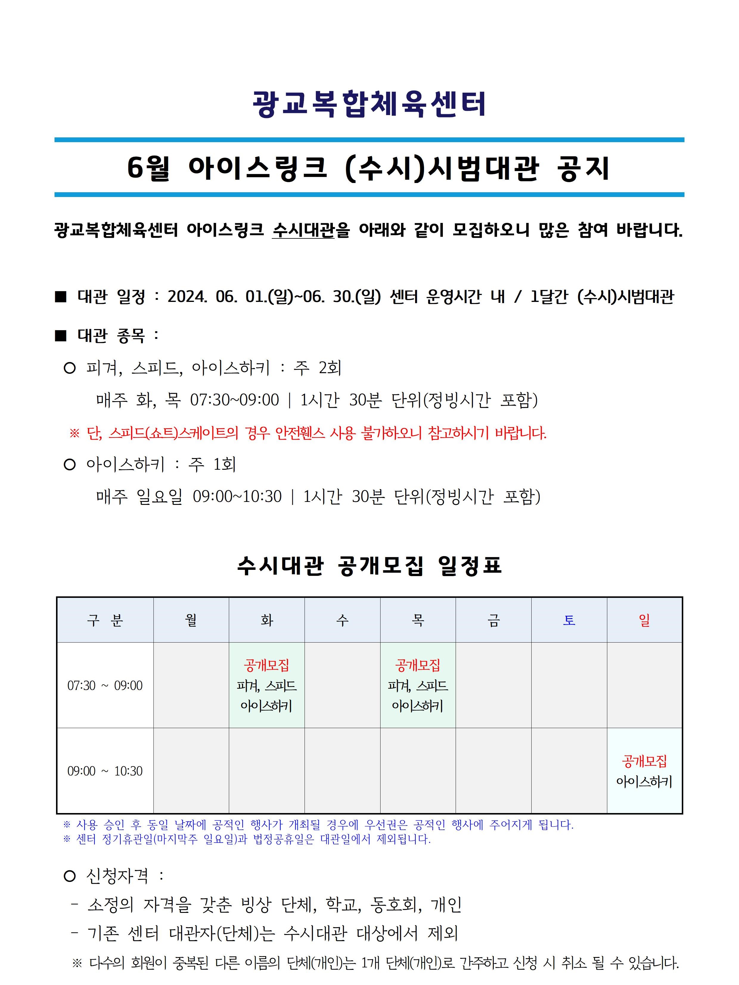 6월 아이스링크장 (수시)시범대관 공지 작성자 관리자 등록일자 2024년 5월 20일 9시 47분 50초 조회 1,328 ('24.06.) 아이스링크 수시대관_공지사항(공지용)001.jpg [ Size : 651.69KB , Down : 1,209 ] 미리보기 다운로드 ('24.06.) 아이스링크 수시대관_공지사항(공지용)002.jpg [ Size : 708.48KB , Down : 1,207 ] 미리보기 다운로드 아이스링크 대관_신청서.hwp [ Size : 265.5KB , Down : 497 ] 다운로드 목록보기