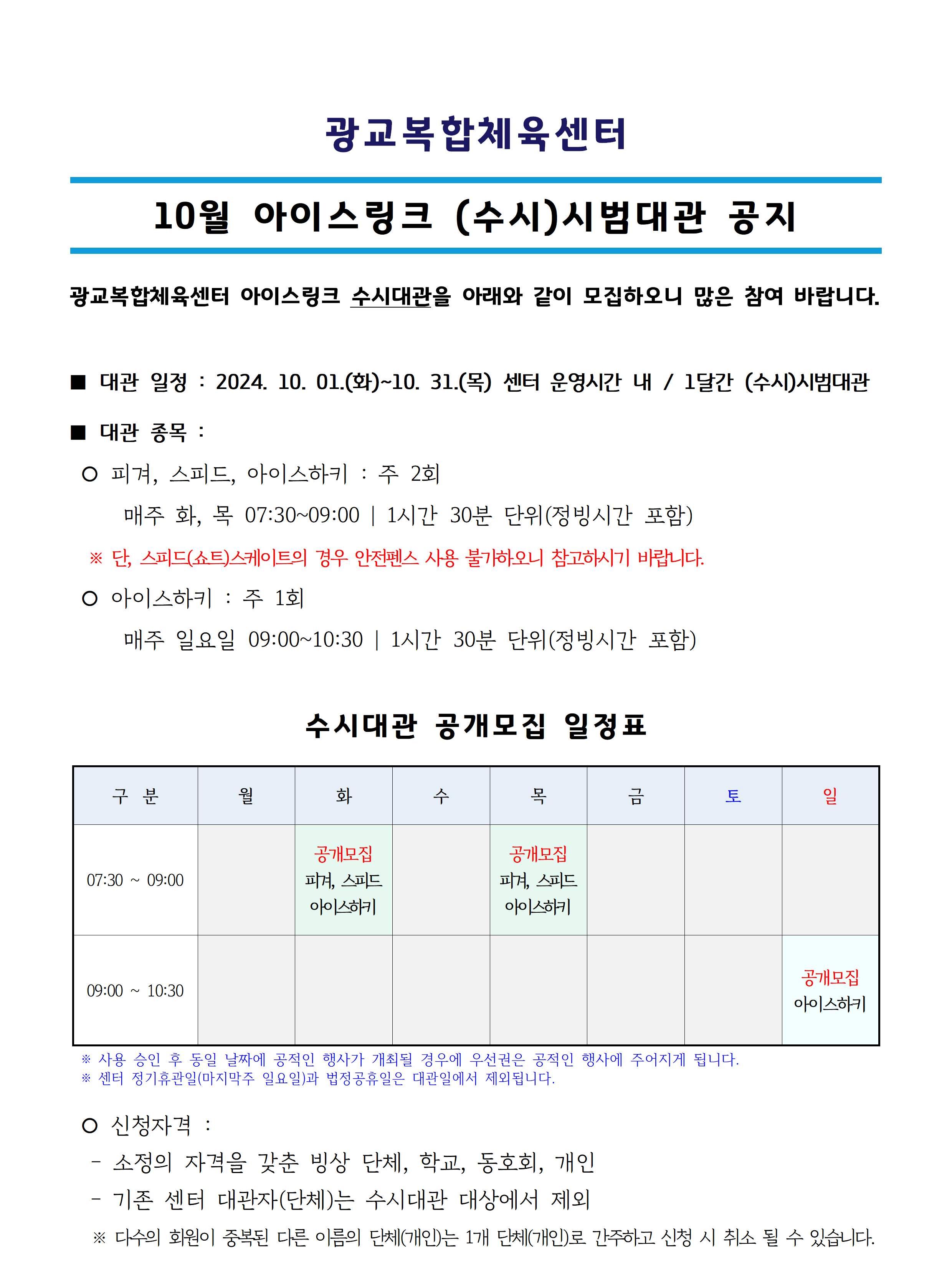 10월 아이스링크장 (수시)시범대관 공지 작성자 관리자 등록일자 2024년 9월 19일 14시 56분 2초 조회 932 ('24.10.) 아이스링크 수시대관_공지사항(공지용)001.png [ Size : 279.78KB , Down : 798 ] 미리보기 다운로드 ('24.10.) 아이스링크 수시대관_공지사항(공지용)002.png [ Size : 339.02KB , Down : 774 ] 미리보기 다운로드 아이스링크 대관_신청서.hwp [ Size : 267KB , Down : 319 ] 다운로드 목록보기