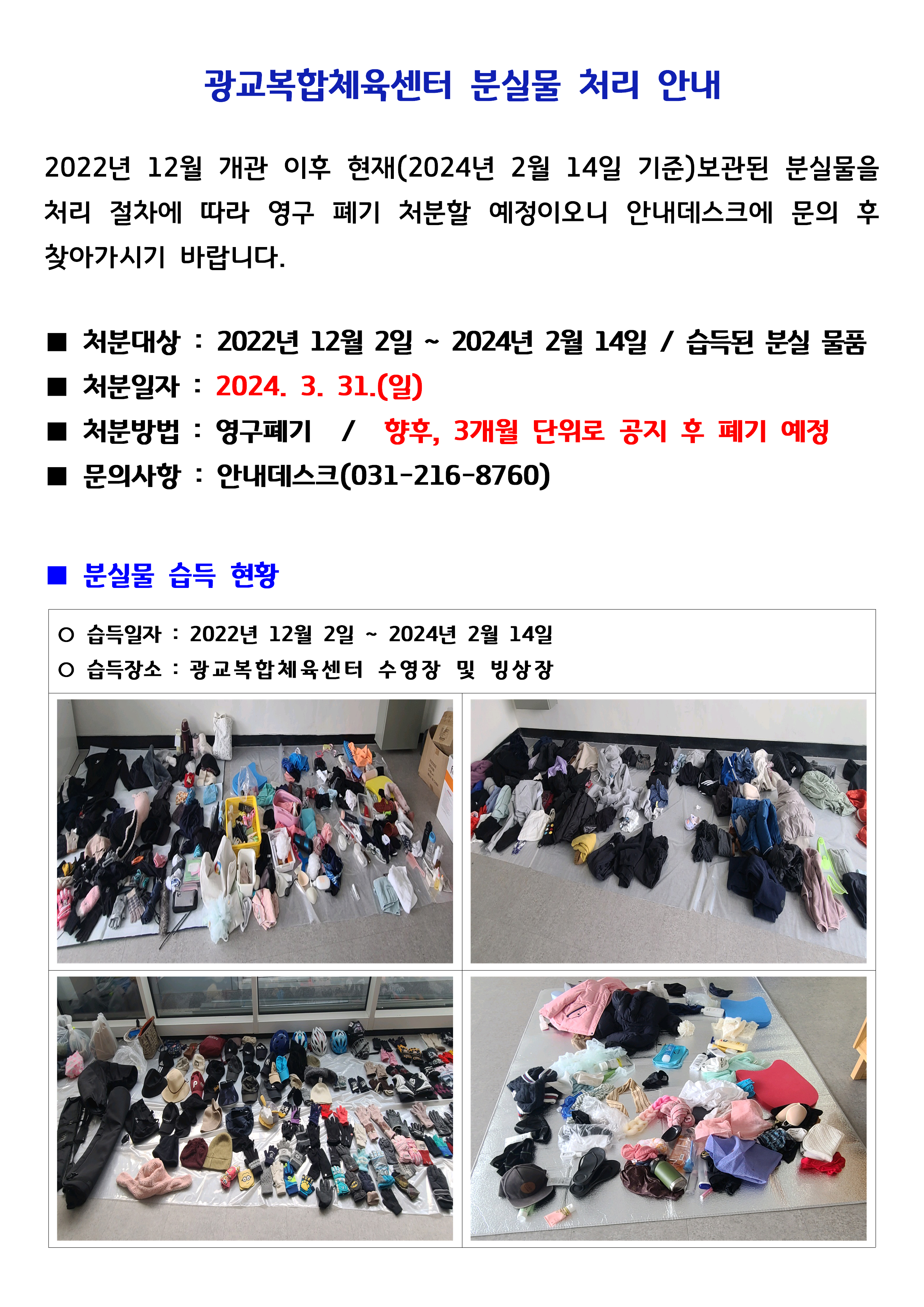 광교복합체육센터 분실물 처리 안내 작성자 관리자 등록일자 2024년 2월 14일 10시 41분 55초 조회 930 분실물처리안내.png [ Size : 4.71MB , Down : 926 ] 미리보기 다운로드 목록보기