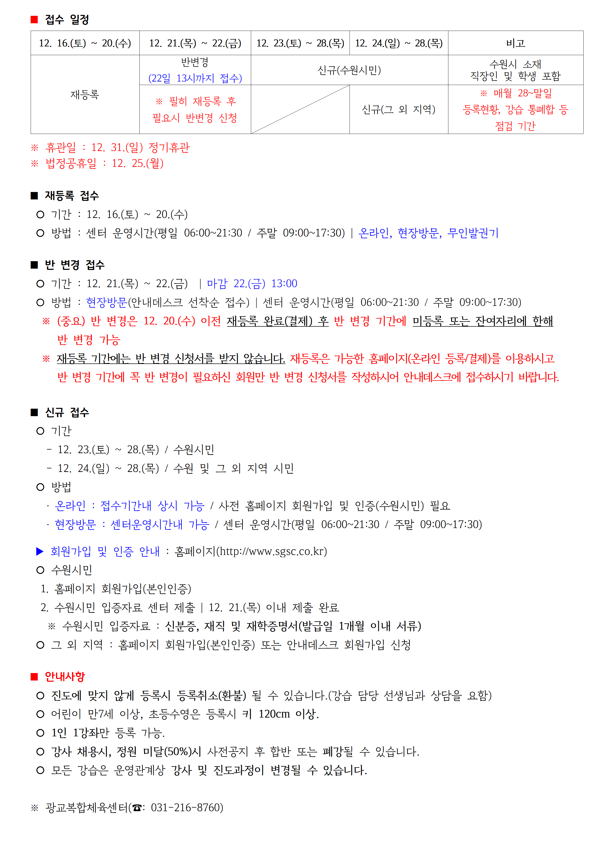 광교복합체육센터 2024. 1월 수영-빙상 진도표 공지