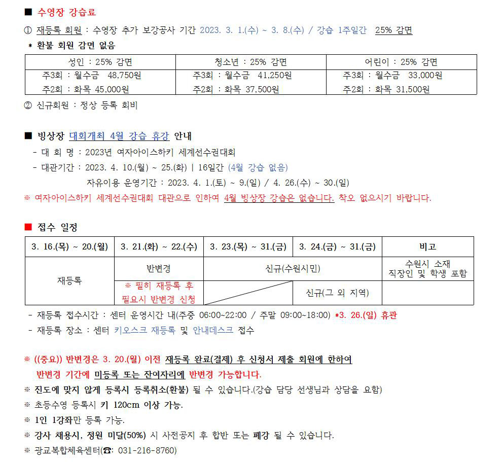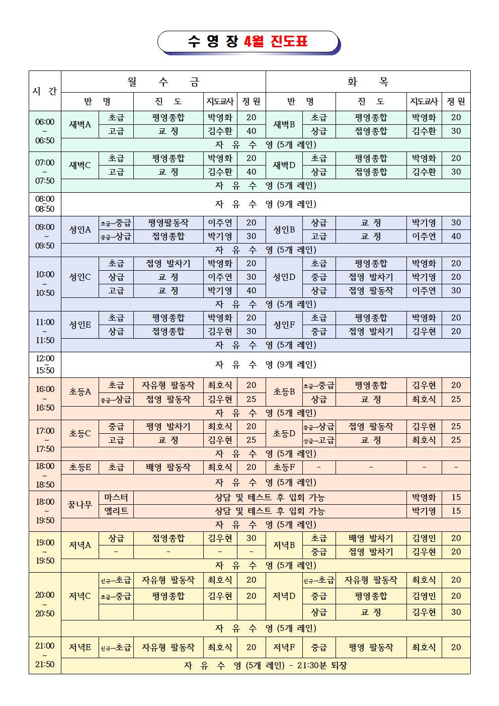 4월 수영-빙상 진도표 공지 작성자 관리자 등록일자 2023년 3월 15일 11시 23분 5초 조회 1,756 2023.04월_수영빙상진도표(공지용)001 (3).jpg [ Size : 250.45KB , Down : 1,343 ] 미리보기 다운로드 2023.04월_수영빙상진도표(공지용)002 (2).jpg [ Size : 212.39KB , Down : 1,198 ] 미리보기 다운로드 목록보기