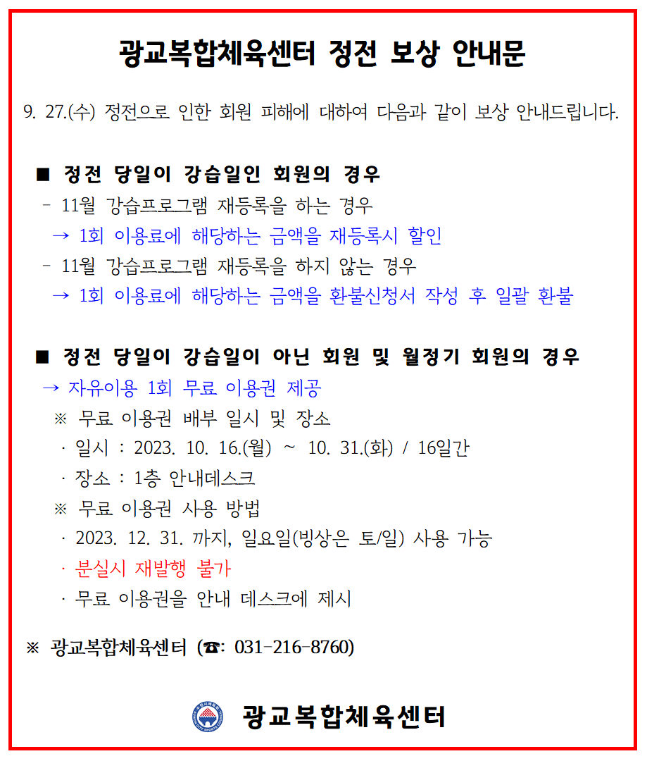 광교복합체육센터 정전 보상 안내 작성자 관리자 등록일자 2023년 10월 14일 18시 28분 17초 조회 1,570 정전 보상 안내문001 - 홈페이지.png [ Size : 99.88KB , Down : 1,651 ] 미리보기 다운로드 목록보기