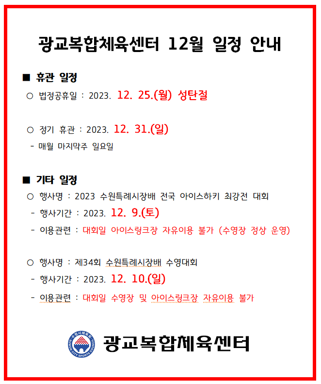 광교복합체육센터 12월 일정(휴관) 안내 작성자 관리자 등록일자 2023년 11월 15일 19시 8분 4초 조회 3,528 12월 일정(휴관일 포함) 공지.png [ Size : 48.43KB , Down : 4,551 ] 미리보기 다운로드 목록보기