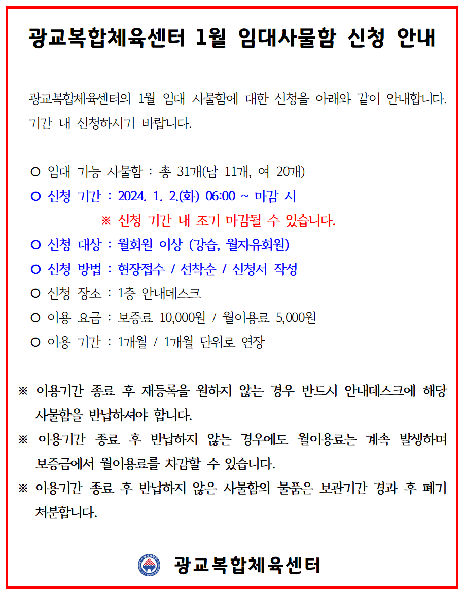 광교복합체육센터 2024년 1월 사물함 신청 안내 작성자 관리자 등록일자 2023년 12월 28일 18시 11분 9초 조회 1,388 1월 임대사물함 신청 안내001.png [ Size : 108.4KB , Down : 1,366 ] 미리보기 다운로드 목록보기