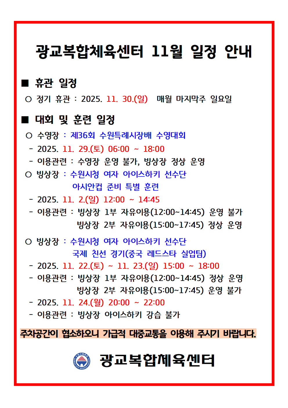 공지 광교복합체육센터 2025년 11월 일정(휴관) 안내 작성자 관리자 등록일자 2025년 10월 15일 17시 40분 22초 조회 992 월별 일정(휴관) 공지_2025_11월001.png [ Size : 107.92KB , Down : 192 ] 미리보기 다운로드 목록보기