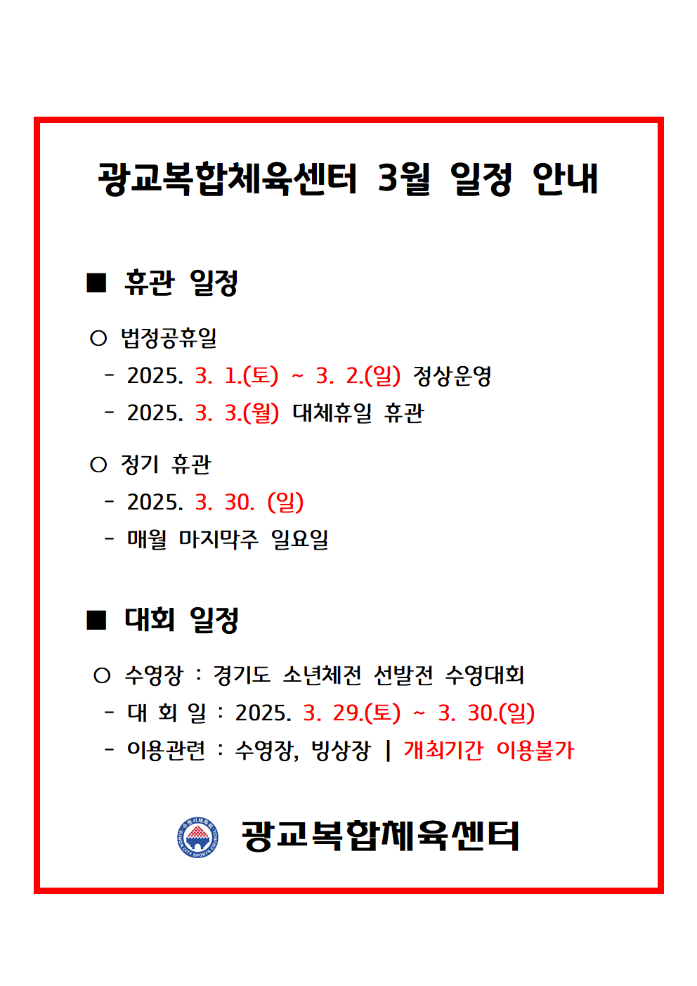 광교복합체육센터 2025년 3월 일정(휴관) 안내 작성자 관리자 등록일자 2025년 2월 14일 16시 42분 36초 조회 2,119 월별 일정(휴관) 공지_2025_03월.png [ Size : 67.65KB , Down : 2,552 ] 미리보기 다운로드 목록보기