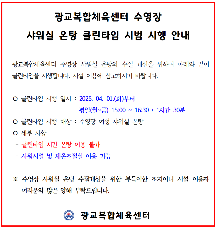 공지 광교복합체육센터 수영장 여성 샤워실 온탕 클린타임 시행 안내 작성자 관리자 등록일자 2025년 3월 7일 17시 58분 24초 조회 1,729 수영장 샤워실 온탕 클린타임 시행 안내001.png [ Size : 77.87KB , Down : 1,827 ] 미리보기 다운로드 목록보기