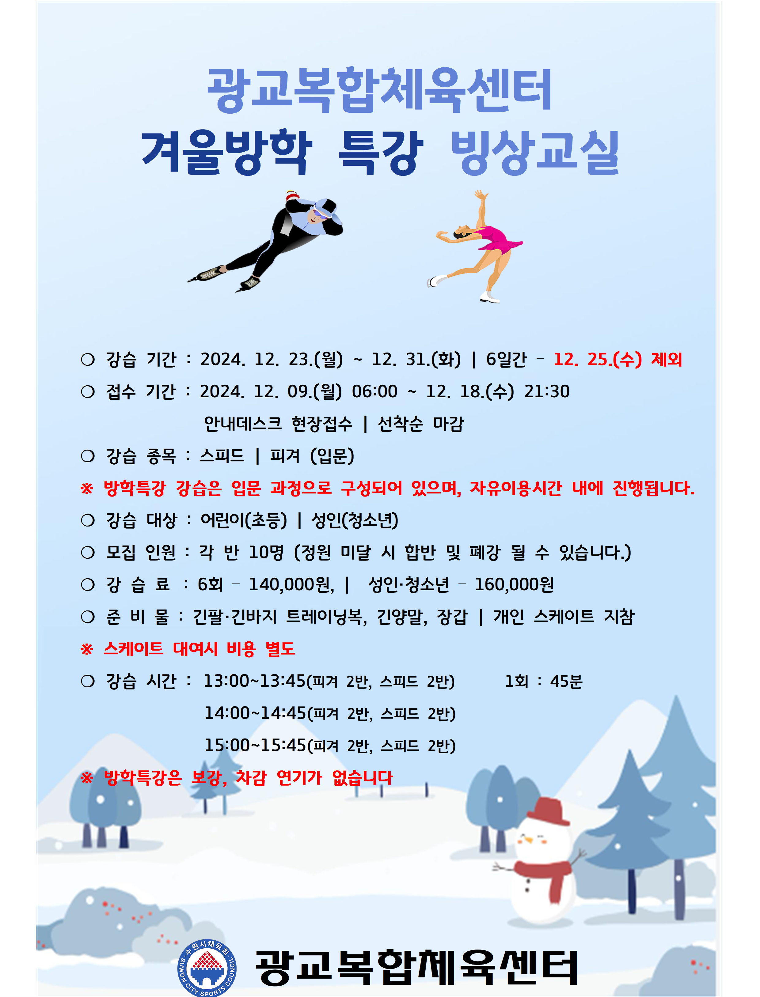 광교복합체육센터 빙상장 겨울방학 특강 운영 공지 작성자 관리자 등록일자 2024년 11월 15일 16시 20분 0초 조회 1,302 2024. 11_겨울방학특강 홍보(최종)001.png [ Size : 1.15MB , Down : 841 ] 미리보기 다운로드 2024. 11_겨울방학특강 홍보(최종)002.png [ Size : 733.16KB , Down : 821 ] 미리보기 다운로드 목록보기