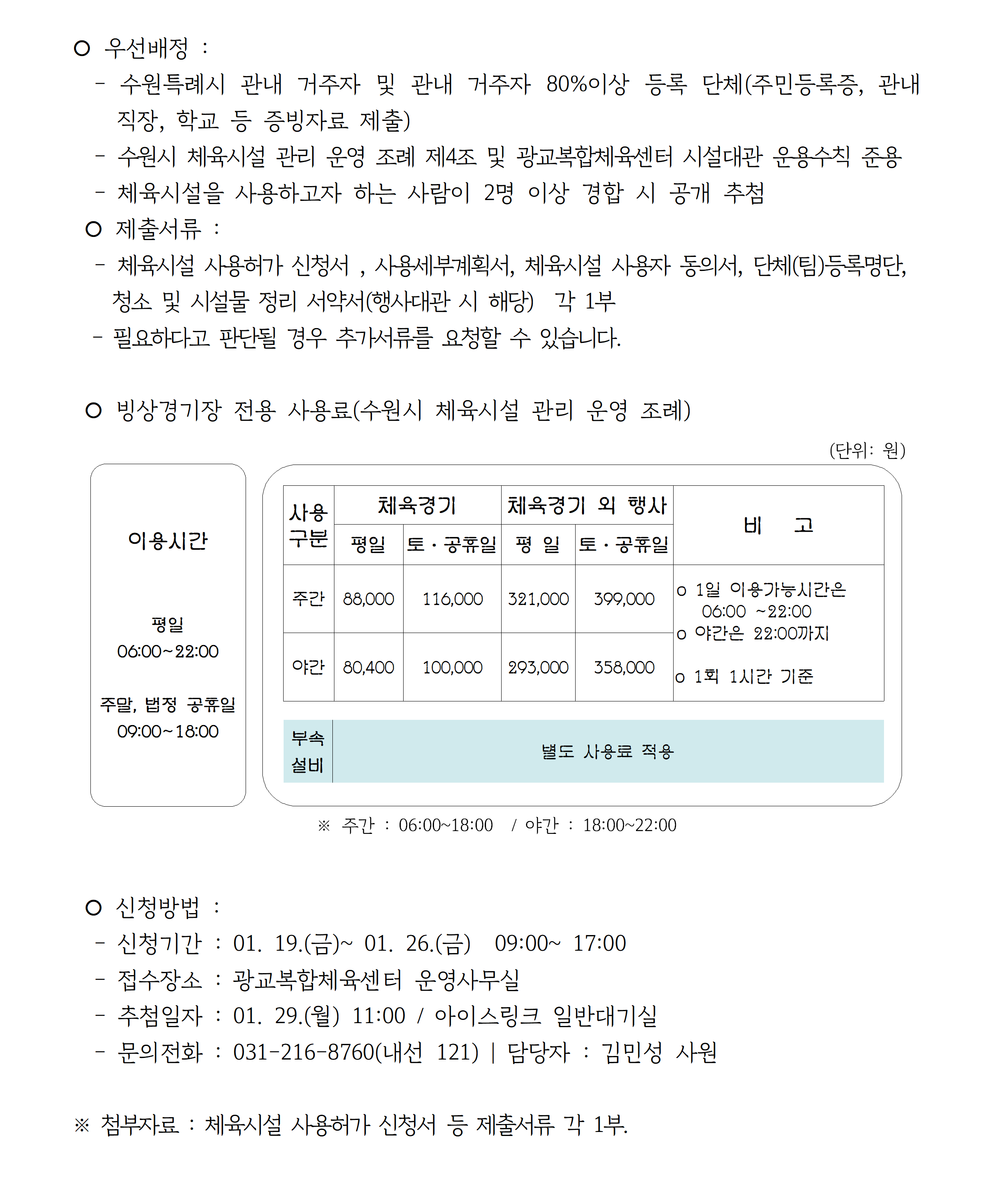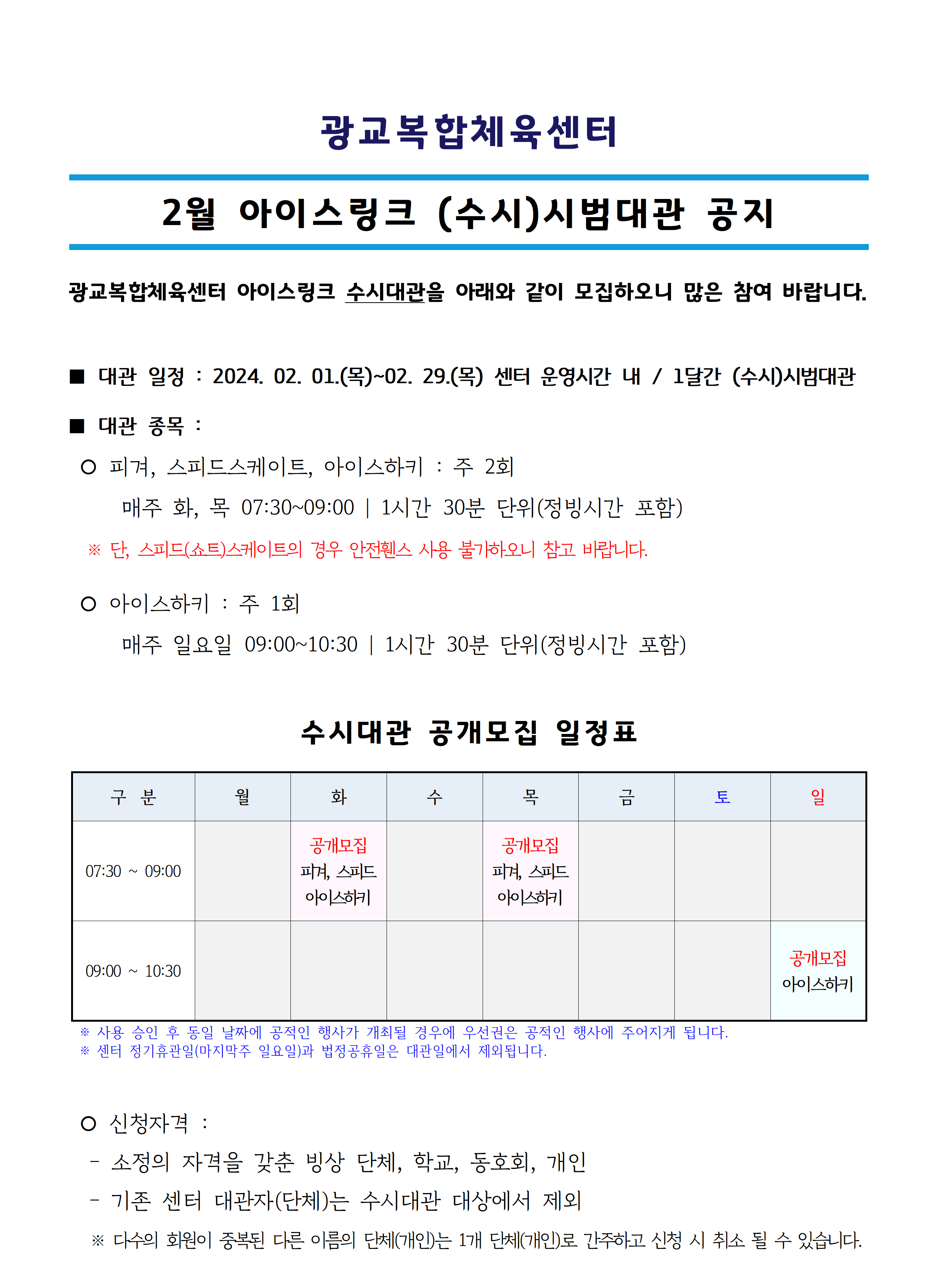 2월 아이스링크장 (수시)시범대관 공지 작성자 관리자 등록일자 2024년 1월 19일 17시 52분 19초 조회 1,181 ('24.02.) 아이스링크 수시대관_공지사항001.png [ Size : 280.4KB , Down : 1,120 ] 미리보기 다운로드 ('24.02.) 아이스링크 수시대관_공지사항002.png [ Size : 339.51KB , Down : 1,105 ] 미리보기 다운로드 수시대관 신청서.pdf [ Size : 164.31KB , Down : 840 ] 다운로드 목록보기