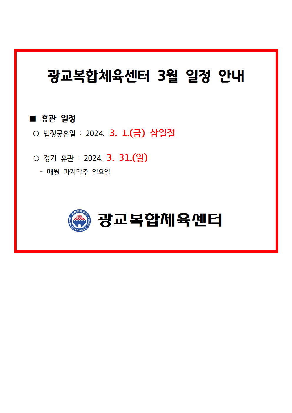 광교복합체육센터 2024년 3월 일정(휴관) 안내 작성자 관리자 등록일자 2024년 2월 15일 16시 11분 43초 조회 4,587 월별일정(휴관) 공지_3.png [ Size : 42.08KB , Down : 5,597 ] 미리보기 다운로드 목록보기