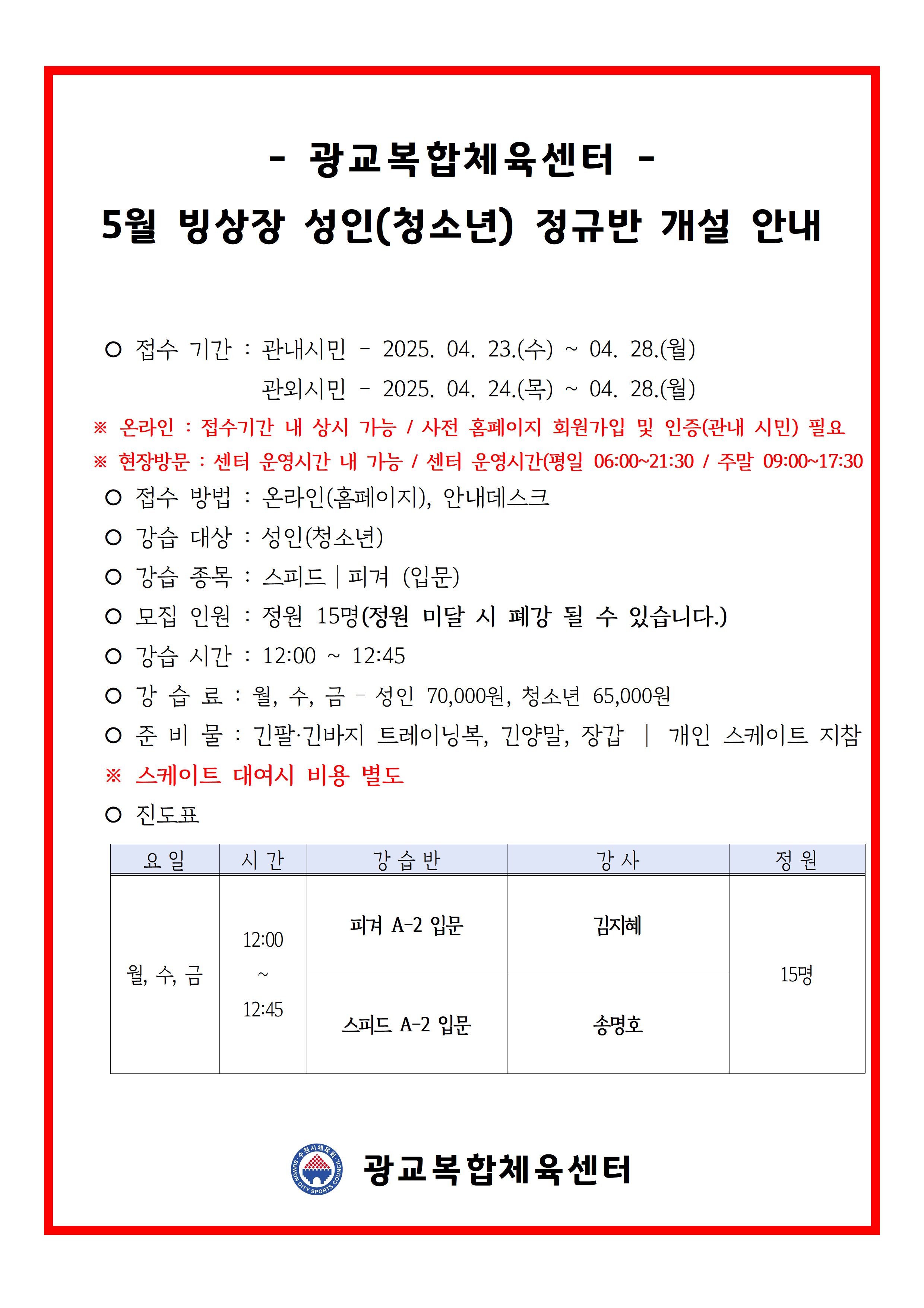 2025년 5월 빙상장 성인(청소년) 정규반 개설 안내 작성자 관리자 등록일자 2025년 4월 18일 15시 16분 16초 조회 1,203 250418_빙상장 성인(청소년) 정규방 개설 공지001.png [ Size : 255.9KB , Down : 1,369 ] 미리보기 다운로드 목록보기