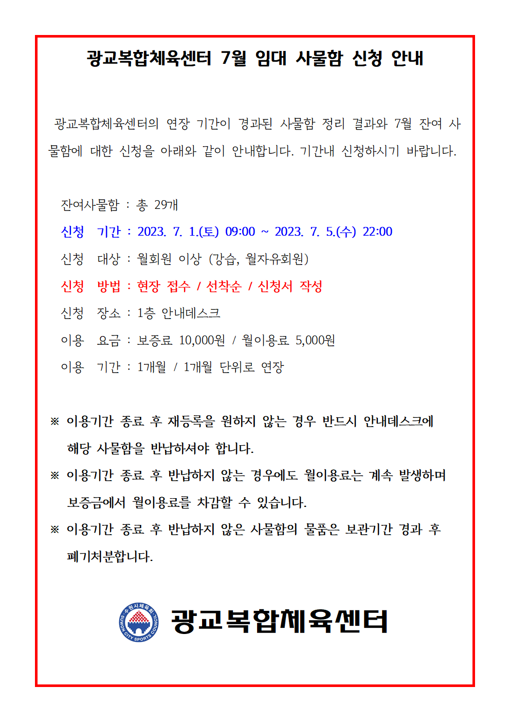 7월 임대 사물함 신규 모집 안내 작성자 관리자 등록일자 2023년 6월 29일 14시 2분 59초 조회 1,499 20230629 7월 사물함 신청 안내001.png [ Size : 92.74KB , Down : 1,421 ] 미리보기 다운로드 목록보기