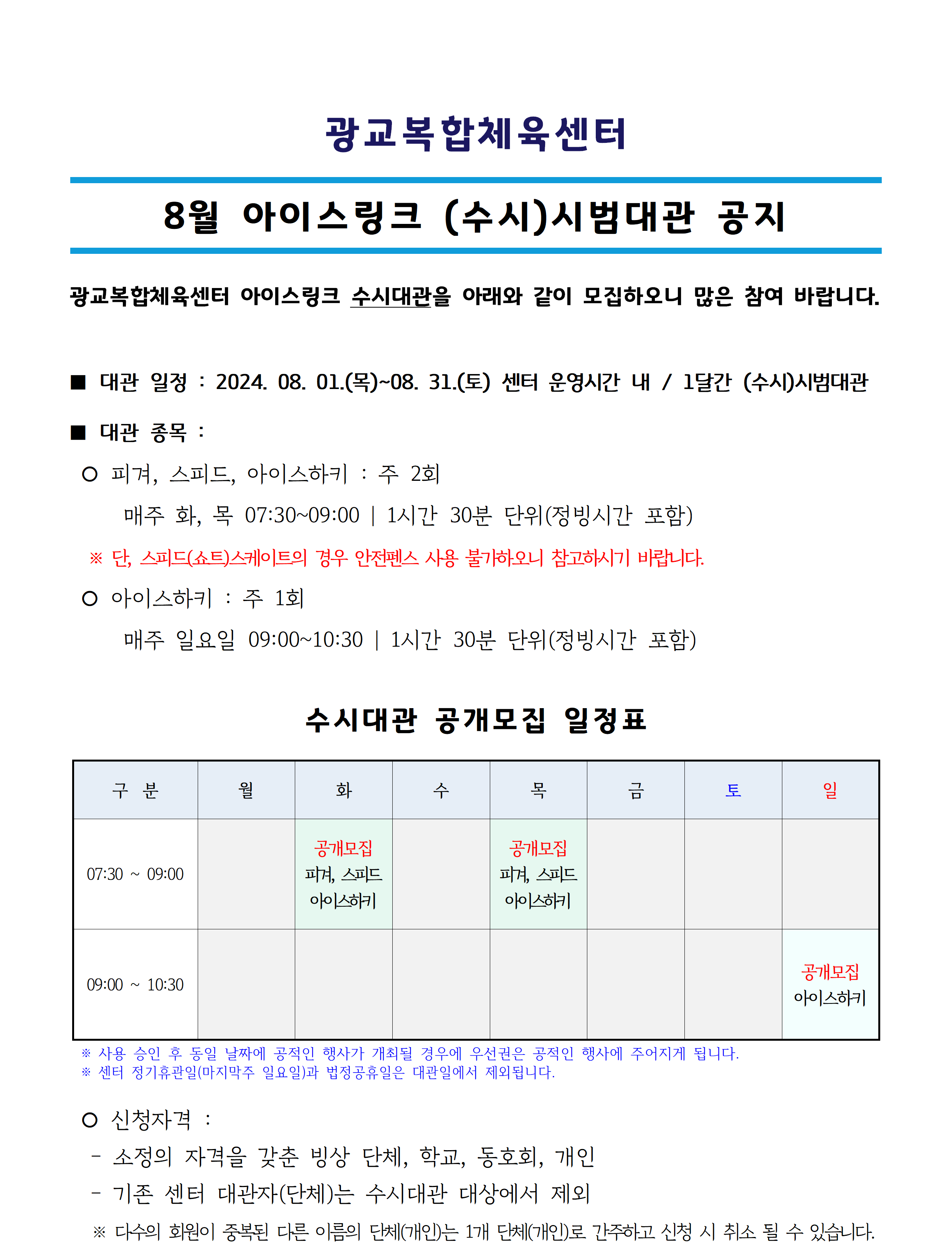 8월 아이스링크장 (수시)시범대관 공지 작성자 관리자 등록일자 2024년 7월 19일 8시 54분 59초 조회 1,345 ('24.08.) 아이스링크 수시대관_공지사항(공지용)001.png [ Size : 280.26KB , Down : 1,290 ] 미리보기 다운로드 ('24.08.) 아이스링크 수시대관_공지사항(공지용)002.png [ Size : 335.04KB , Down : 1,302 ] 미리보기 다운로드 아이스링크 대관_신청서.hwp [ Size : 266.5KB , Down : 369 ] 다운로드 목록보기