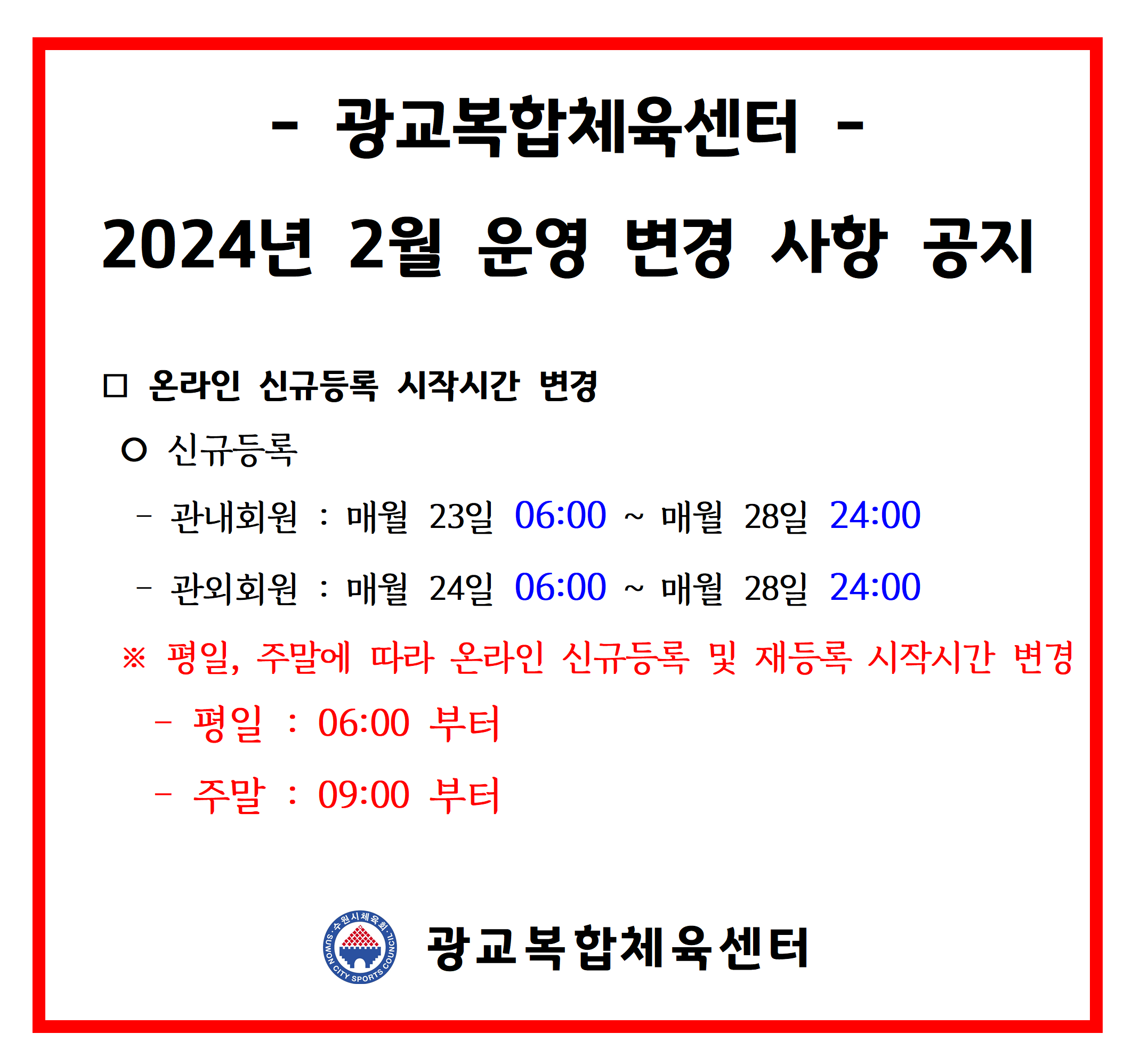 광교복합체육센터 2024년 2월 운영 변경 사항 공지 작성자 관리자 등록일자 2024년 2월 5일 9시 41분 35초 조회 3,202 2024년 2월 변경사항 공지001.png [ Size : 171.47KB , Down : 3,861 ] 미리보기 다운로드 목록보기