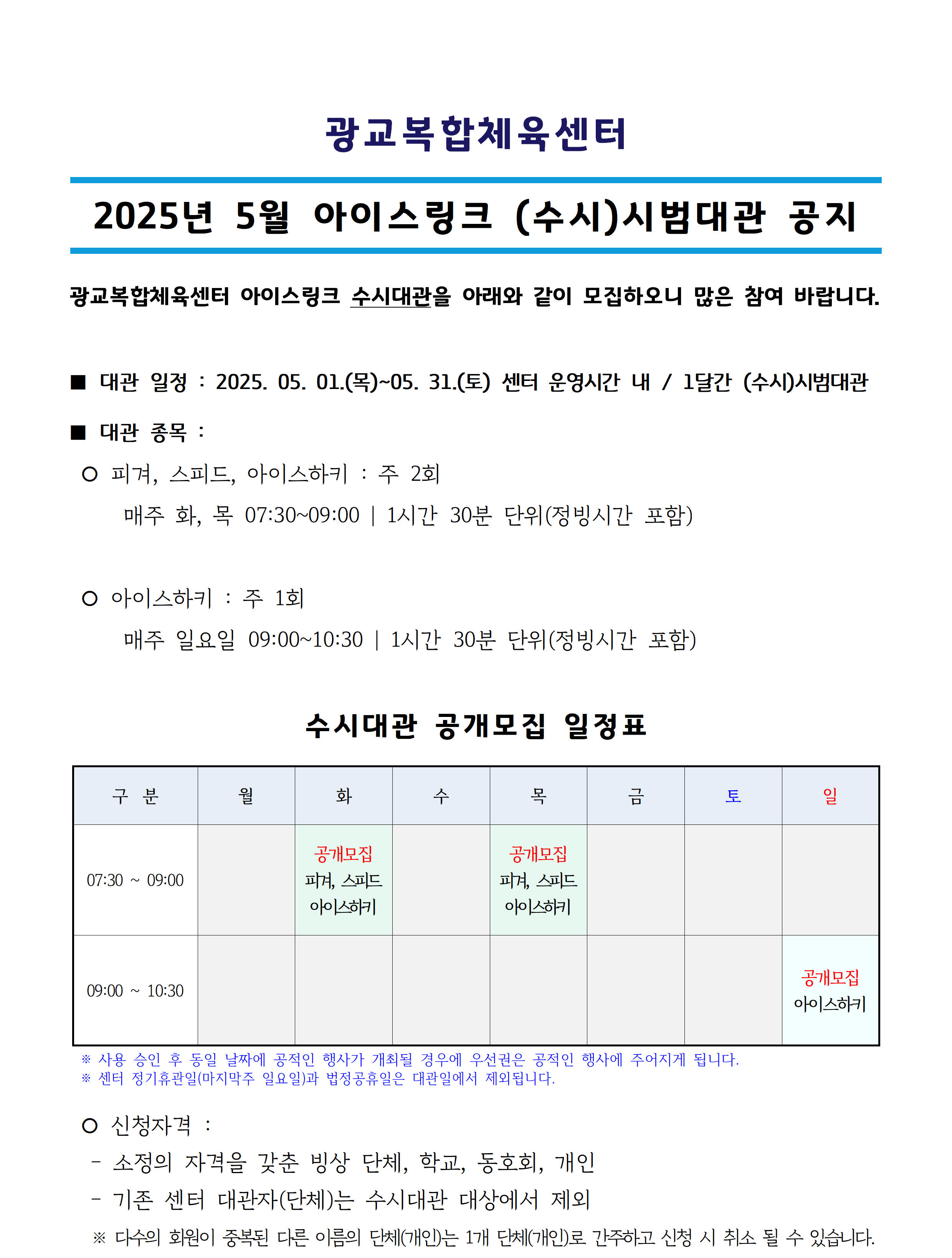 2025년 5월 아이스링크장 (수시)시범대관 공지 작성자 관리자 등록일자 2025년 4월 17일 9시 54분 6초 조회 649 ('25.05) 아이스링크 수시대관_공지사항(공지용)001.png [ Size : 269.42KB , Down : 524 ] 미리보기 다운로드 ('25.05) 아이스링크 수시대관_공지사항(공지용)002.png [ Size : 346.71KB , Down : 546 ] 미리보기 다운로드 아이스링크 대관_신청서.hwp [ Size : 267KB , Down : 235 ] 다운로드 목록보기