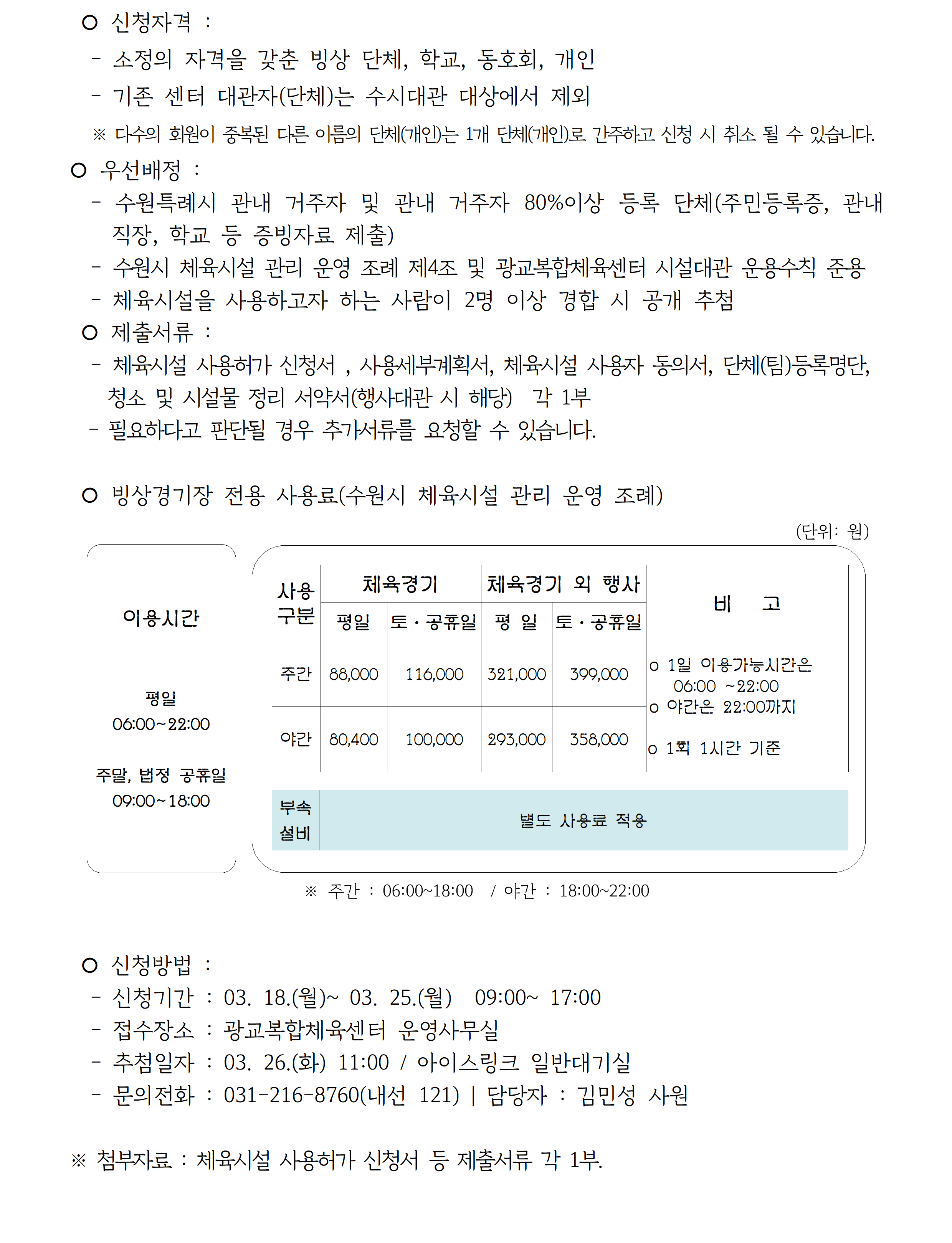 4월 아이스링크장 (수시)시범대관 공지 작성자 관리자 등록일자 2024년 3월 18일 13시 38분 0초 조회 1,145 ('24.04.) 아이스링크 수시대관_공지사항(공지용)001.png [ Size : 301.04KB , Down : 1,144 ] 미리보기 다운로드 ('24.04.) 아이스링크 수시대관_공지사항(공지용)002.png [ Size : 395.47KB , Down : 1,063 ] 미리보기 다운로드 대관 신청서.hwp [ Size : 249.5KB , Down : 447 ] 다운로드 목록보기