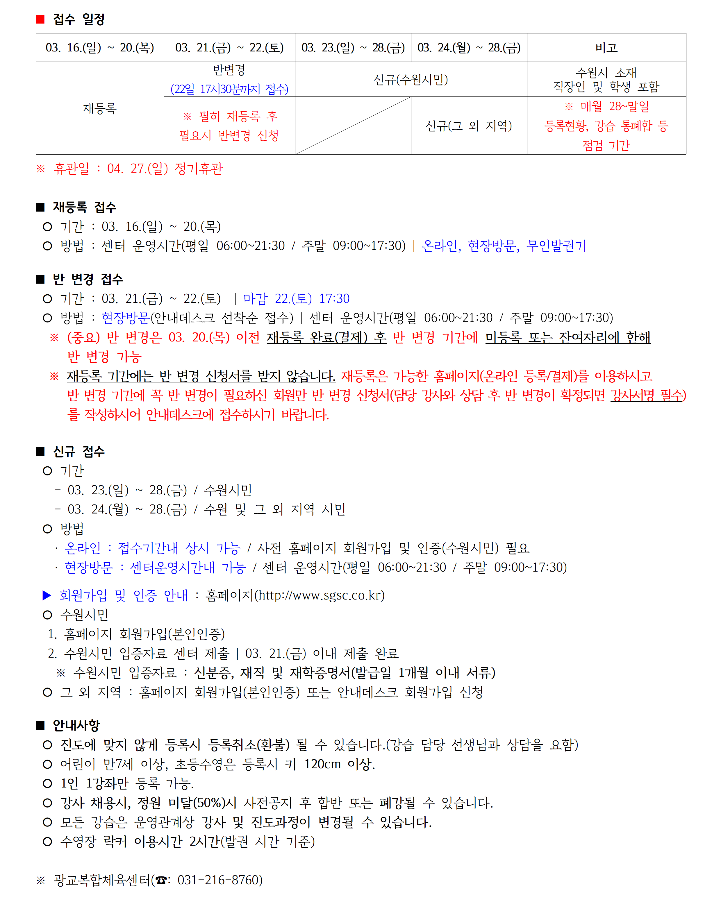 광교복합체육센터 2025년 4월 수영-빙상 진도표 공지(수정공지)
