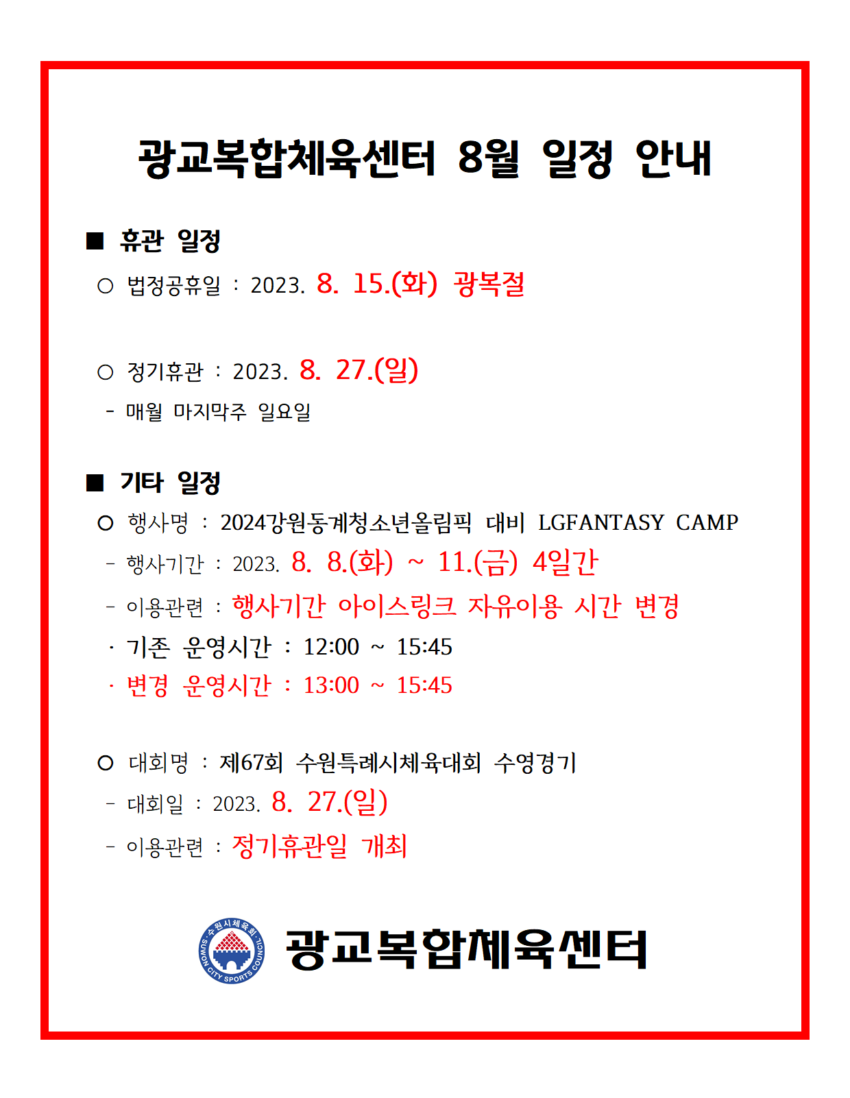 광교복합체육센터 8월 일정(휴관) 안내 작성자 관리자 등록일자 2023년 8월 1일 8시 50분 8초 조회 3,687 8월 일정(휴관) 공지_001.png [ Size : 102.68KB , Down : 4,337 ] 미리보기 다운로드 목록보기