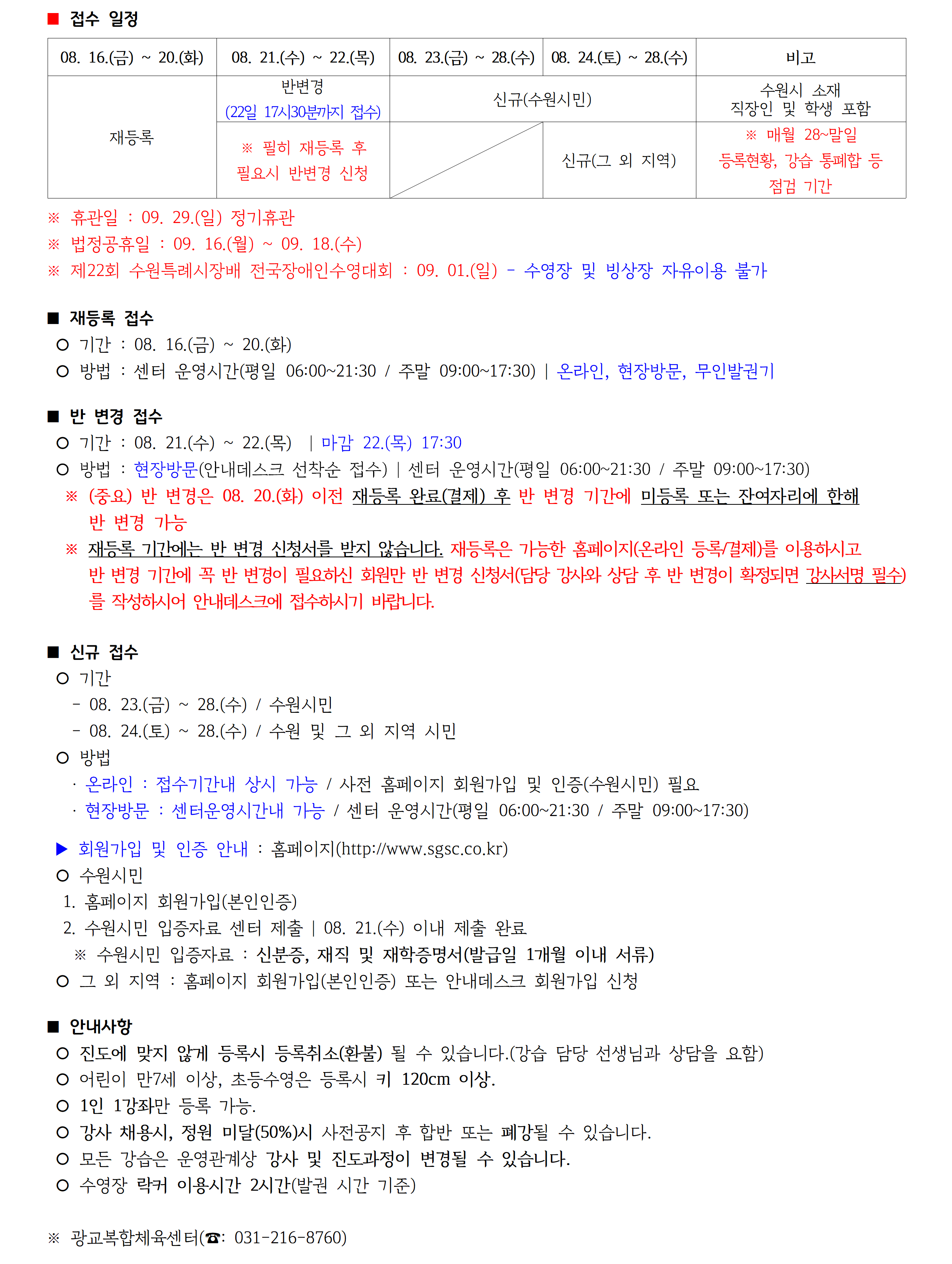 광교복합체육센터 9월 수영-빙상 진도표 공지