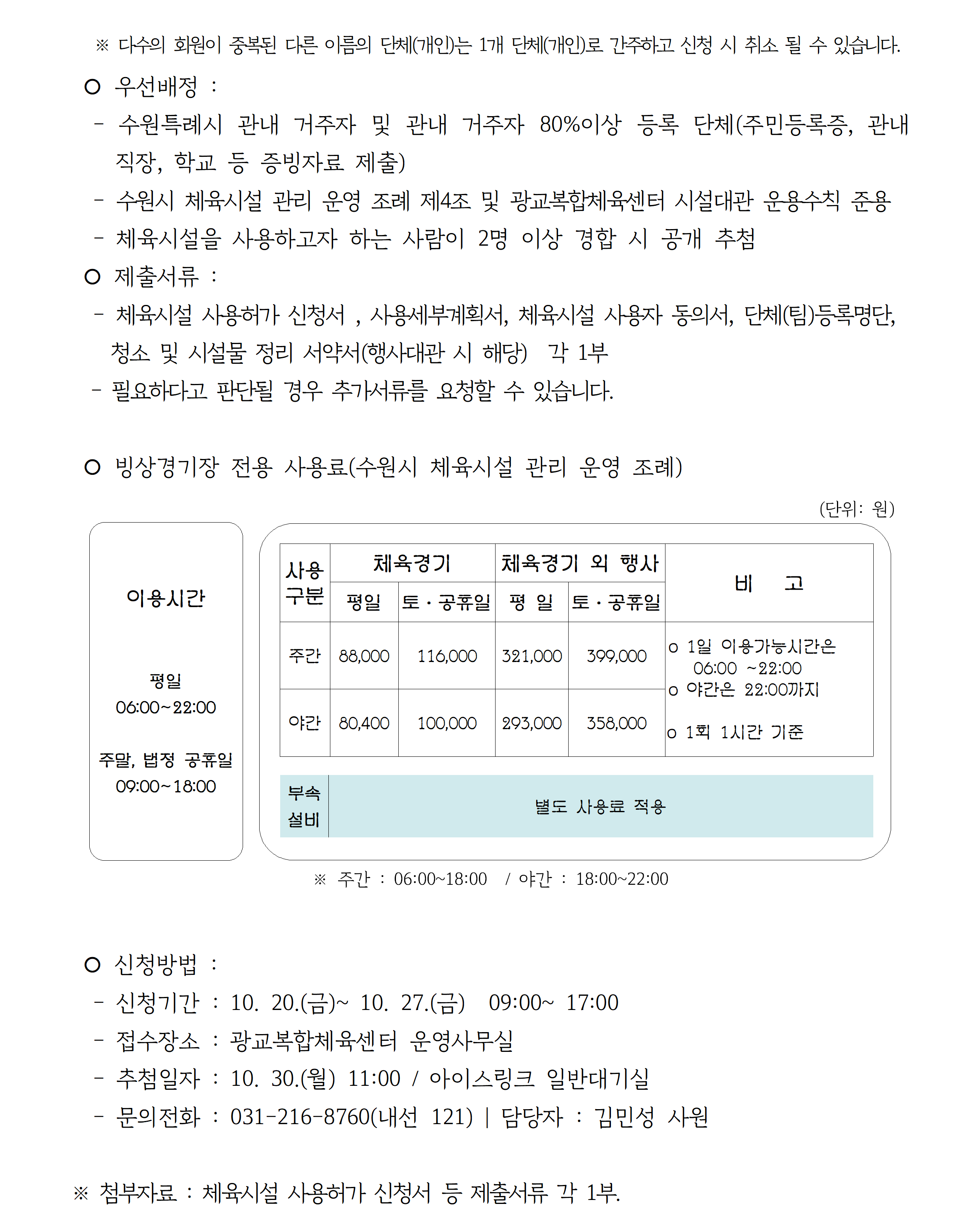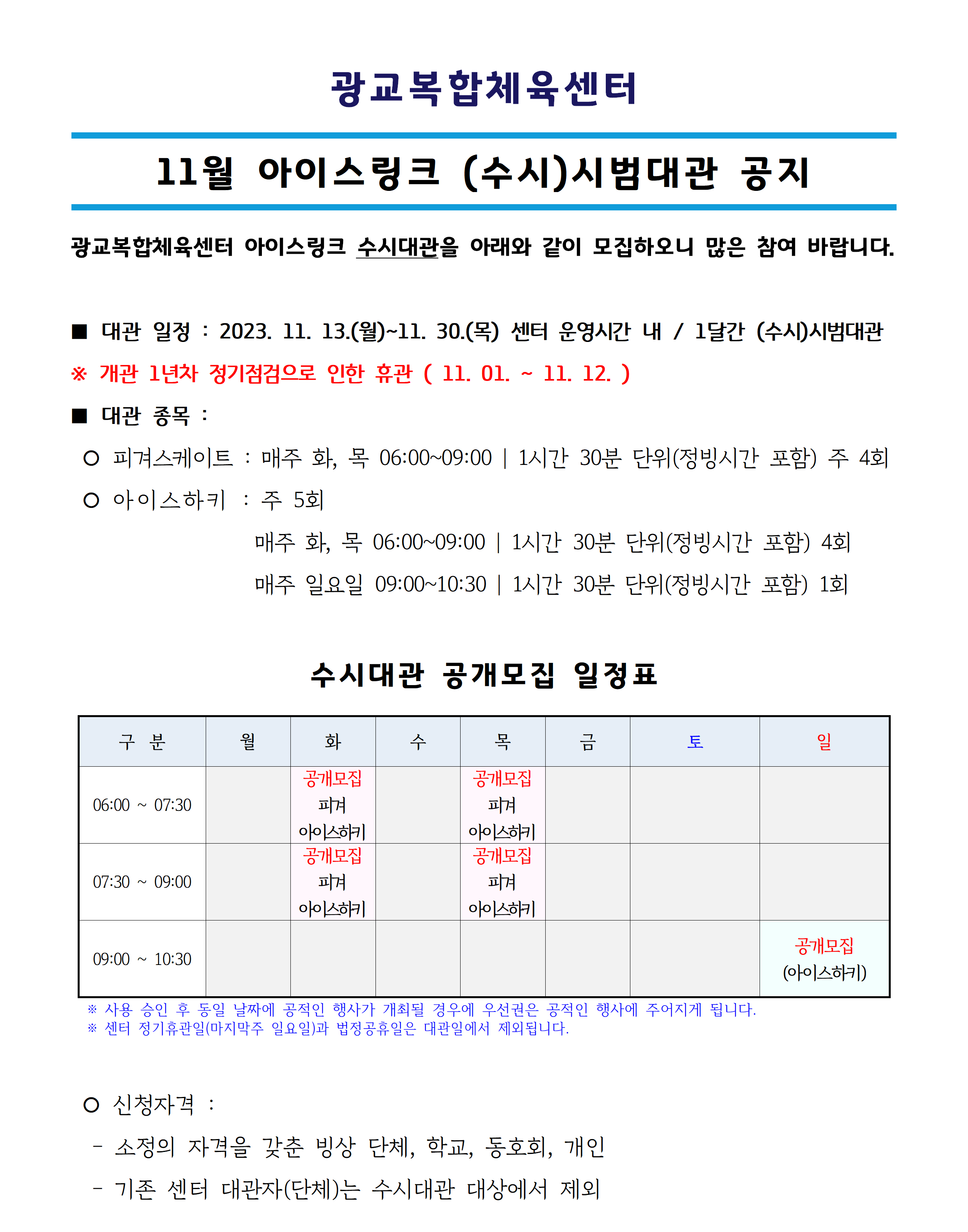11월 아이스링크장 (수시)시범대관 공지 작성자 관리자 등록일자 2023년 10월 19일 16시 33분 49초 조회 1,239 ('23.11.) 아이스링크 수시대관_공지사항001.png [ Size : 272.58KB , Down : 1,606 ] 미리보기 다운로드 ('23.11.) 아이스링크 수시대관_공지사항002.png [ Size : 359.35KB , Down : 1,461 ] 미리보기 다운로드 ('23.11.) 아이스링크 수시대관_신청서.pdf [ Size : 173.86KB , Down : 578 ] 다운로드 목록보기