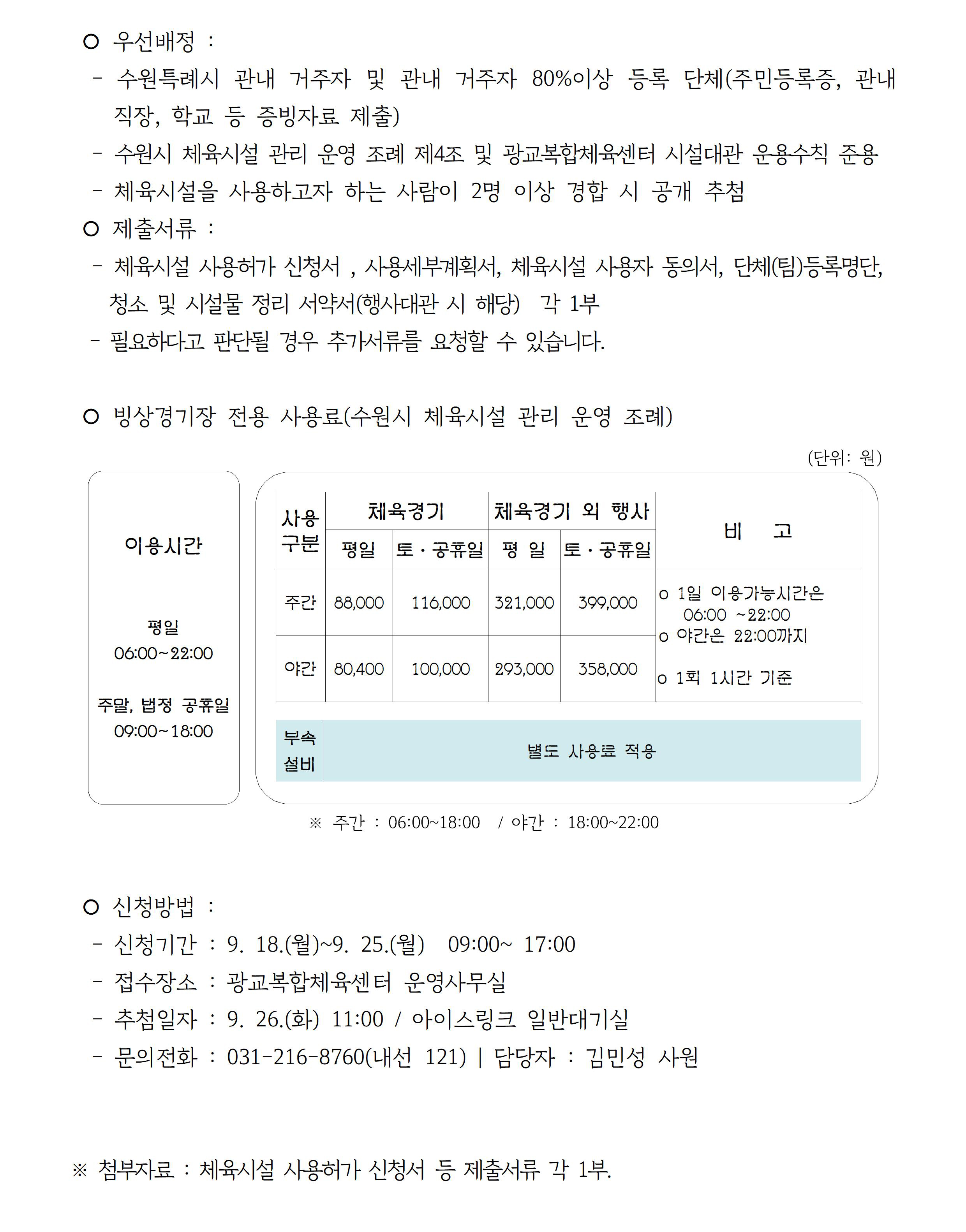 10월 아이스링크장 (수시)시범대관 공지 작성자 관리자 등록일자 2023년 9월 18일 9시 5분 46초 조회 1,293 ('23.10.) 아이스링크 수시대관_공지사항001.jpg [ Size : 1.66MB , Down : 1,446 ] 미리보기 다운로드 ('23.10.) 아이스링크 수시대관_공지사항002.jpg [ Size : 1.74MB , Down : 1,379 ] 미리보기 다운로드 ('23.10.) 아이스링크 수시대관_신청서.pdf [ Size : 173.86KB , Down : 609 ] 다운로드 목록보기