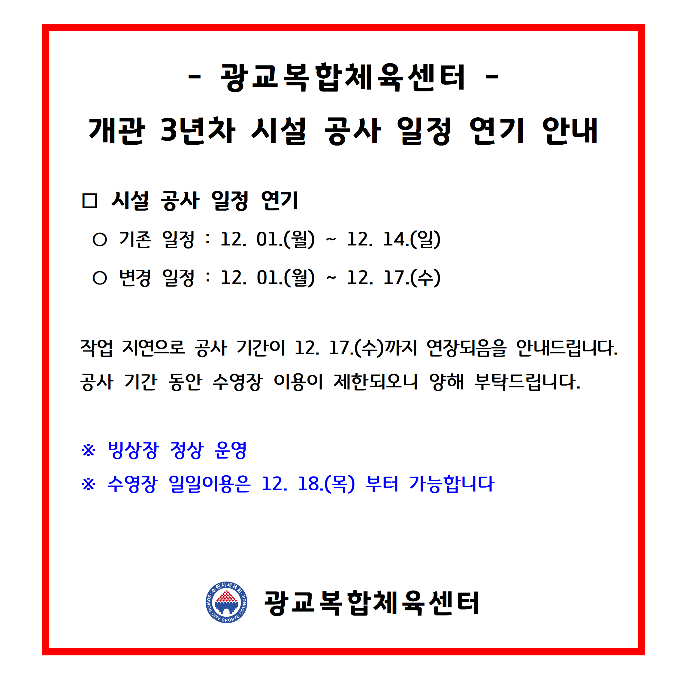 공지 광교복합체육센터 2025년 12월 개관 3년차 시설 공사 일정 연기 안내 작성자 관리자 등록일자 2025년 12월 9일 9시 52분 39초 조회 146 1.png [ Size : 178.52KB , Down : 129 ] 미리보기 다운로드 목록보기