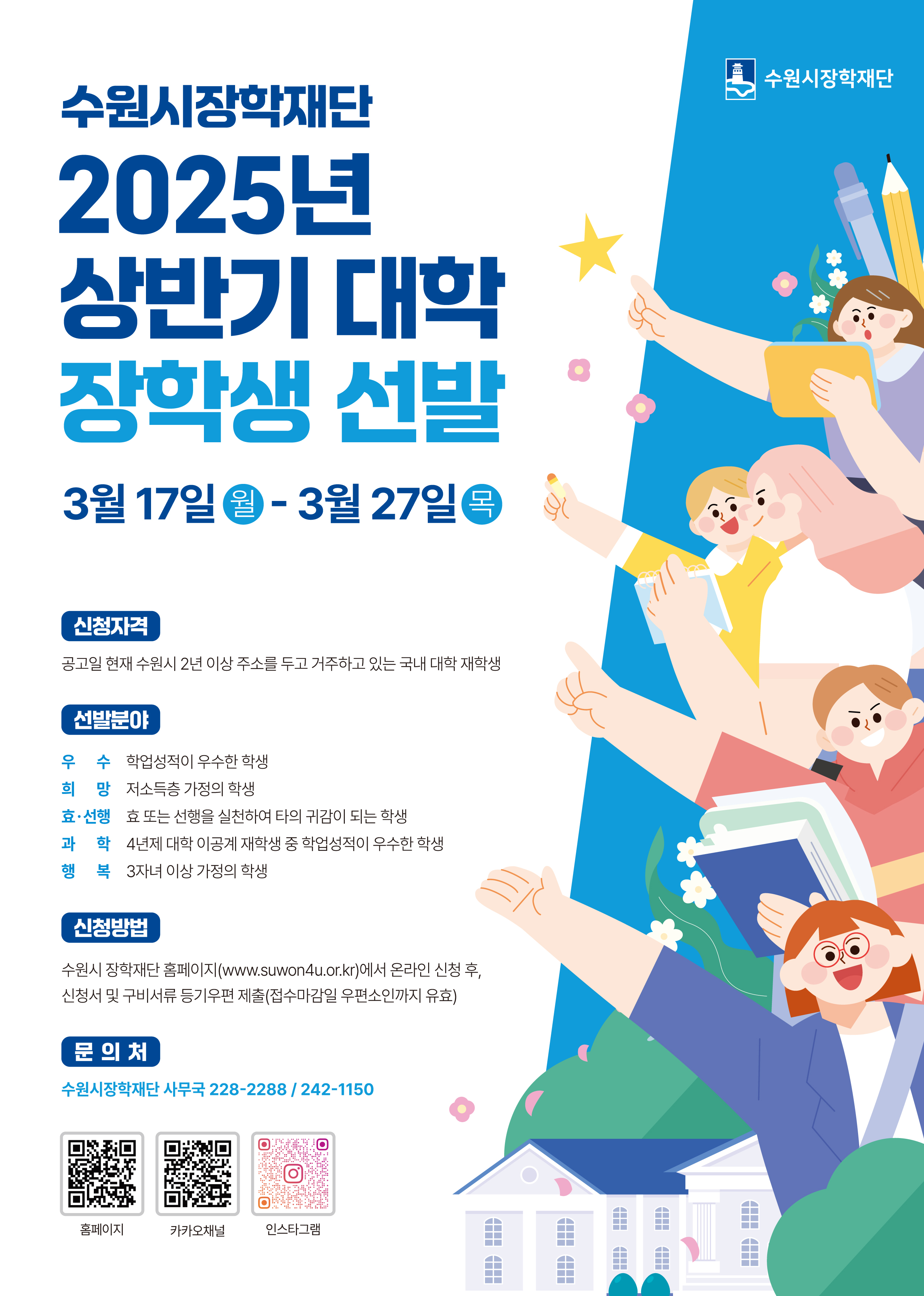 수원시장학재단 2025년 상반기 장학생 선발 안내 작성자 관리자 등록일자 2025년 3월 7일 11시 36분 21초 조회 1,298 수원시장학재단 2025년 하반기 장학생 선발 홍보 안내문.jpg [ Size : 1.75MB , Down : 1,330 ] 미리보기 다운로드 목록보기